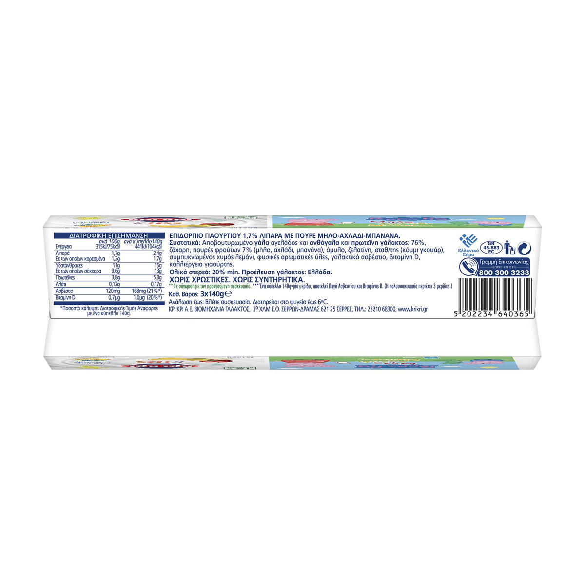 Ένα απολαυστικό παιδικό επιδόρπιο γιαουρτιού με 3 θρεπτικά φρούτα: μήλο, αχλάδι και μπανάνα, παρέα με την αγαπημένη μας Peppa! Παρασκευάζεται μόνο από 100% ελληνικό γάλα ημέρας, χωρίς συντηρητικά και χρωστικές, αποτελεί καλή πηγή ασβεστίου και βιταμίνης D αλλά και την υγιεινή επιλογή για ένα θρεπτικό γευματάκι με λίγες θερμίδες και χαμηλά λιπαρά που θα λατρέψει κάθε παιδί.