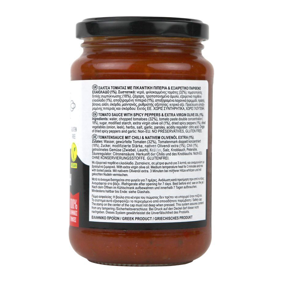 Σάλτσα τομάτας με καυτερή επίγευση, η ελληνική εκδοχή της Αραμπιάτα. Ιδανική για ζυμαρικά, σαγανάκια, αλλά και για μπρουσκέτες, πίτσα, θαλασσινά ή κρέας.