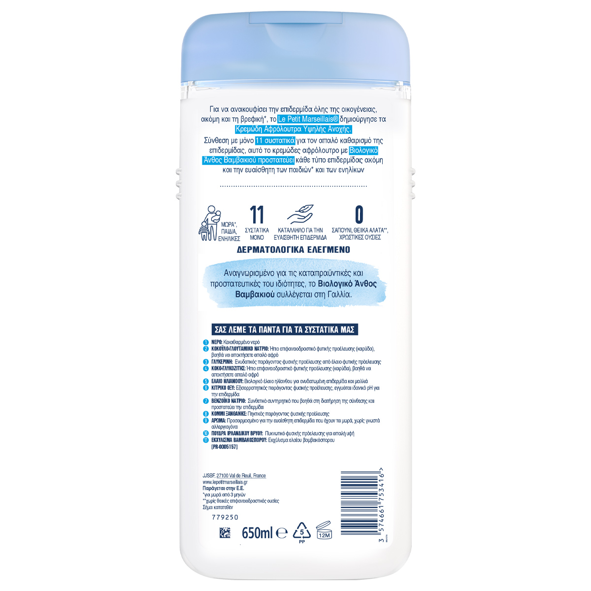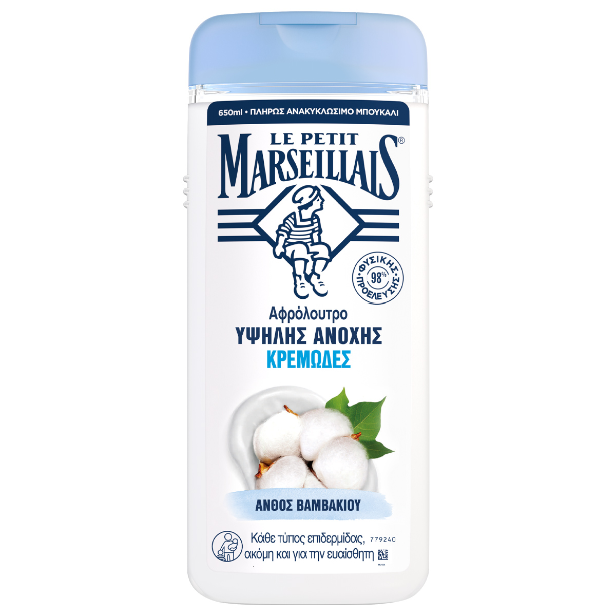 Για να ανακουφίσει την επιδερμίδα όλης της οικογένειας, ακόμη και τη βρεφική, το Le Petit Marseillais® δημιούργησε τα Κρεμώδη Αφρόλουτρα Υψηλής Ανοχής. Χάρη στην μοναδική σύνθεσή του με μόνο 11 συστατικά, αυτό το κρεμώδες αφρόλουτρο με Άνθος Βαμβακιού προστατεύει και καθαρίζει κάθε τύπο επιδερμίδας ακόμη και την ευαίσθητη των παιδιών και των ενηλίκων.Κατάλληλο για κάθε τύπο επιδερμίδας, Δερματολογικά Ελεγμένο, 0 σαπούνι, θεεικά άλατα, χρωστικές ουσίες.