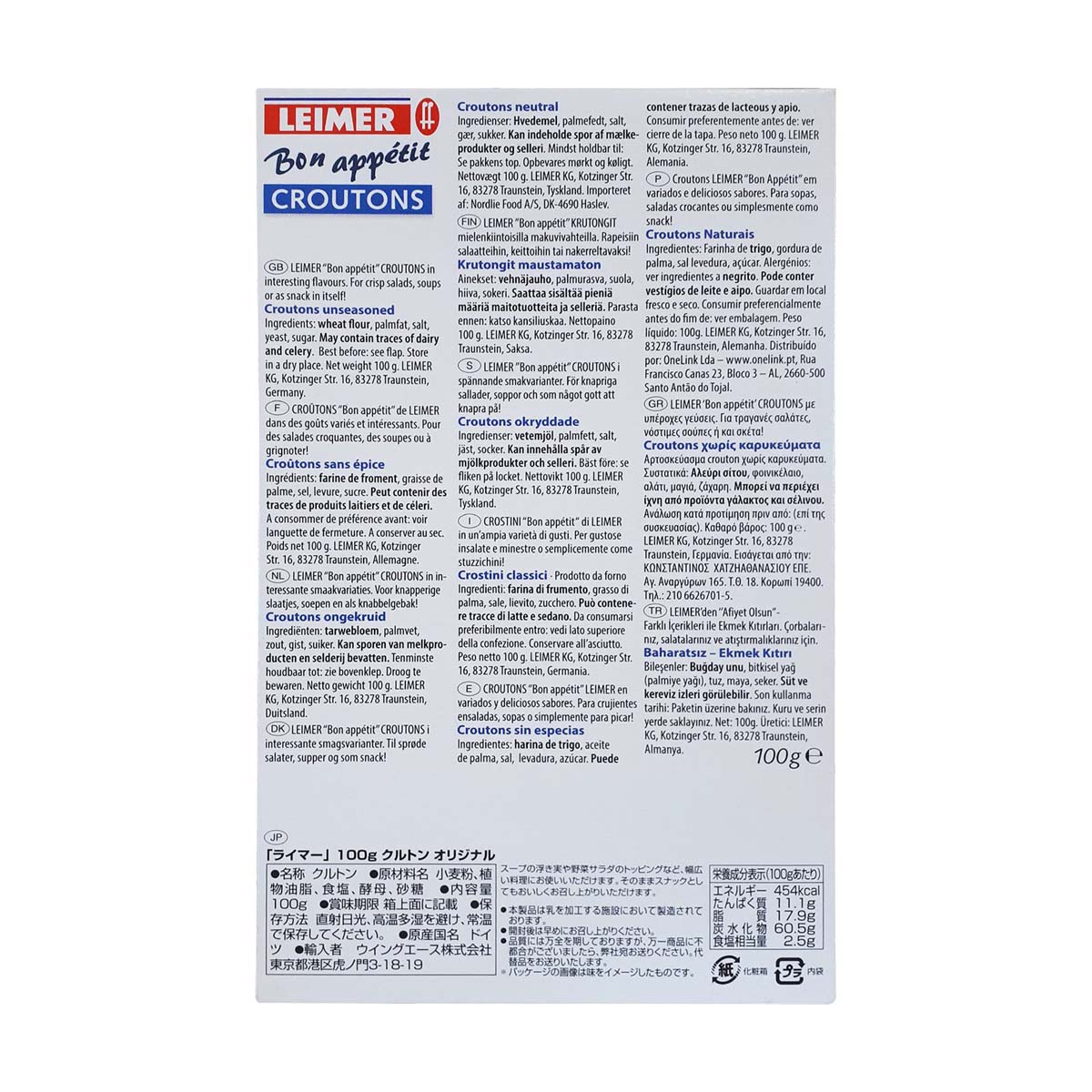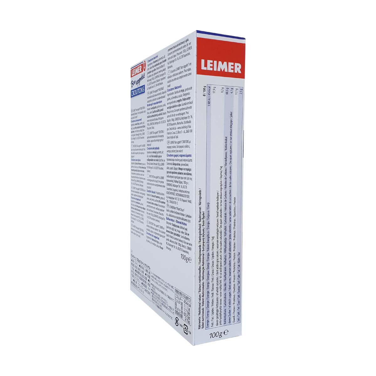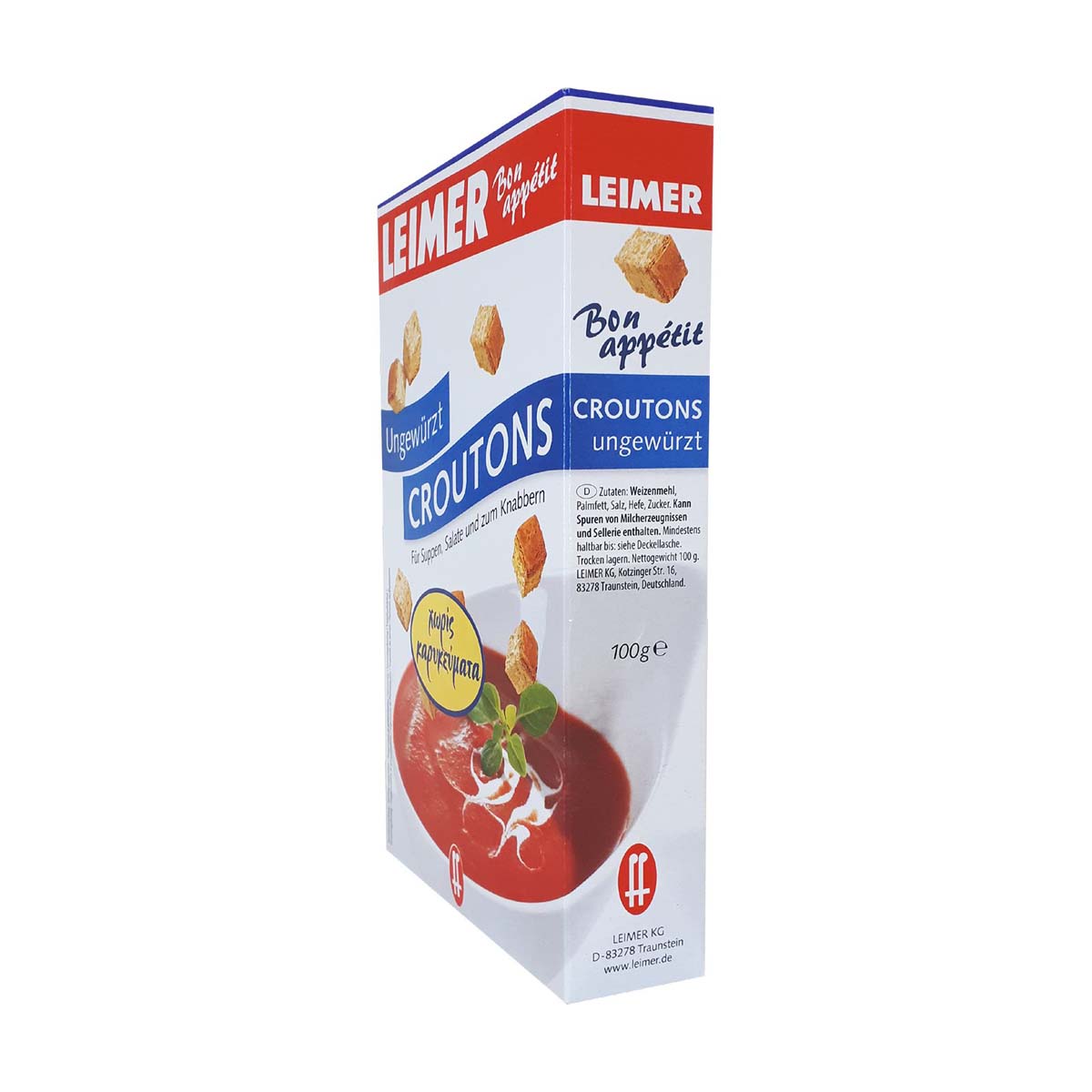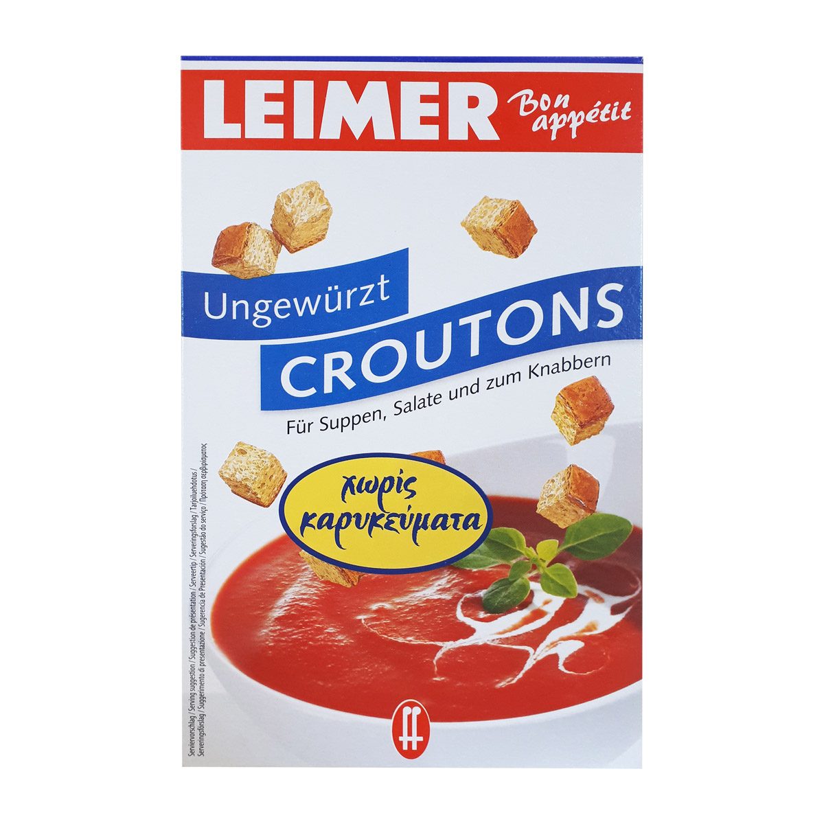 Τα τραγανά κρουτόνς της LEIMER φτιάχνονται από φρεσκοψημένο λευκό ψωμί. Αμέσως μετά το ψήσιμο, το ψωμί κόβεται σε κύβους και φρυγανίζεται προσεκτικά. Το τέλειο τελείωμα σε σαλάτες και σούπες. Κατάλληλο και ως σνάκ.