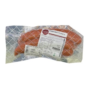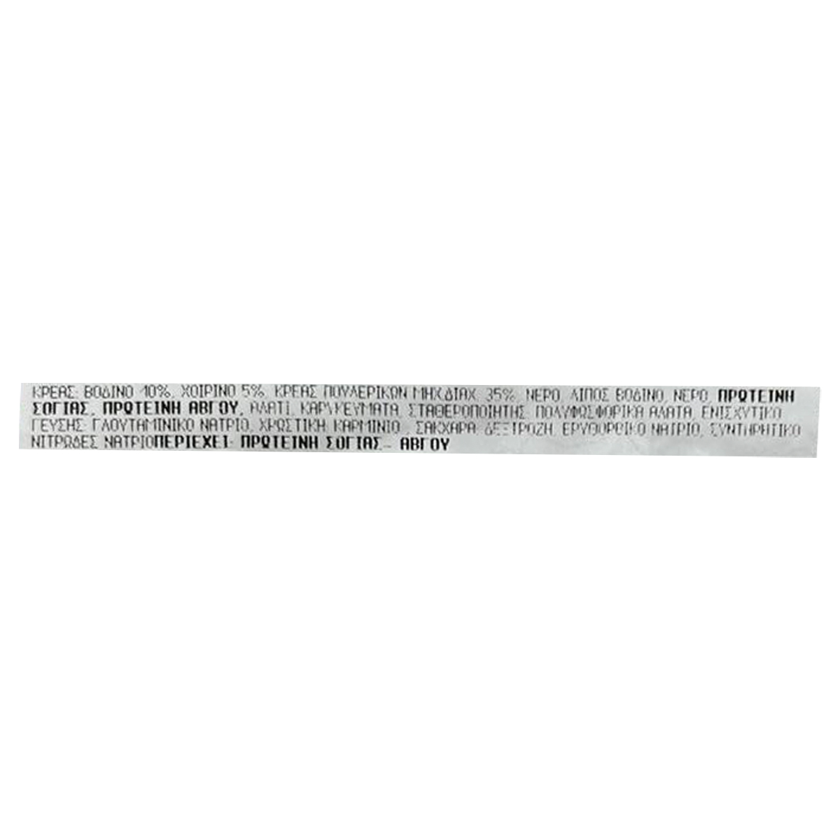 Βοδινό 10%, χοιρινό 5%, κρέας πουλερικών μηχανικά διαχωρισμένο 35%, νερό, λίπος βοδινό, νερό, πρωτεϊνη ΣΟΓΙΑΣ, πρωτεϊνη ΑΥΓΟΥ, αλάτι, καρυκεύματα, σταθεροποιητής: πολυφωσφορικά άλατα, ενισχυτικό γεύσης: γλουταμινικό νάτριο, χρωστική καρμίνιο, σάκχαρα, δεξτρόζη, ερυθορβικό νάτριο, συντηρητικό: νιτρώδες νάτριο.