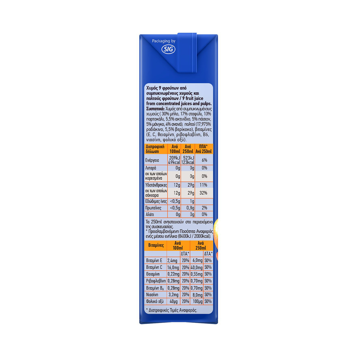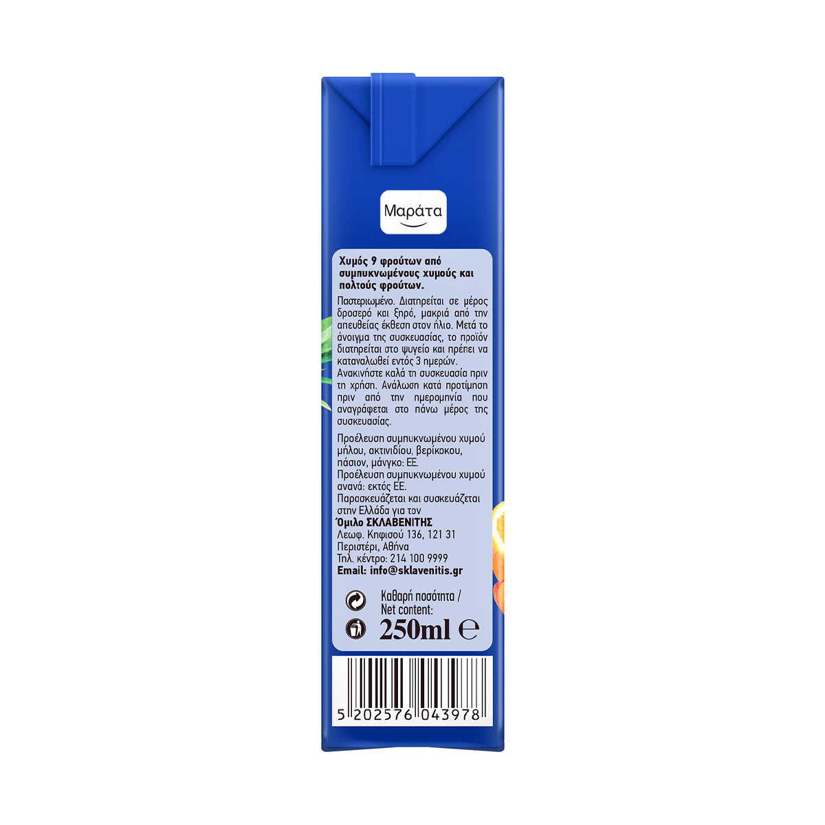 Απολαύστε το χυμό Μαράτα με υπέροχη γεύση και βιταμίνες από 9 φρούτα - μήλο, σταφύλι, πορτοκάλι, ακτινίδιο, πάσιον, μάνγκο, ανανά, ροδάκινο και βερίκοκο! Με φυσικά σάκχαρα, χωρίς πρόσθετα σάκχαρα.
