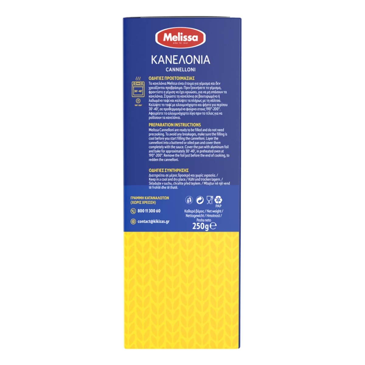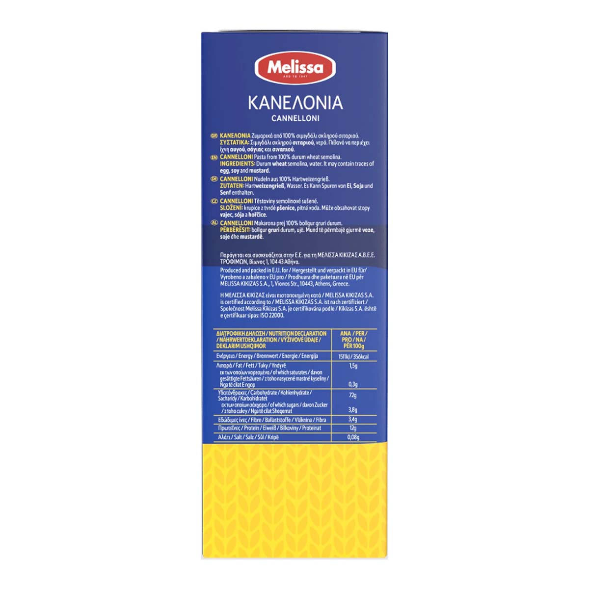 Τα Κανελόνια Melissa παράγεται από εκλεκτά σιτάρια αποκτώντας χρυσαφένιο χρώμα και αυθεντική γεύση. Δεν χρειάζονται προβράσιμο και είναιι έτοιμα για γέμισμα!