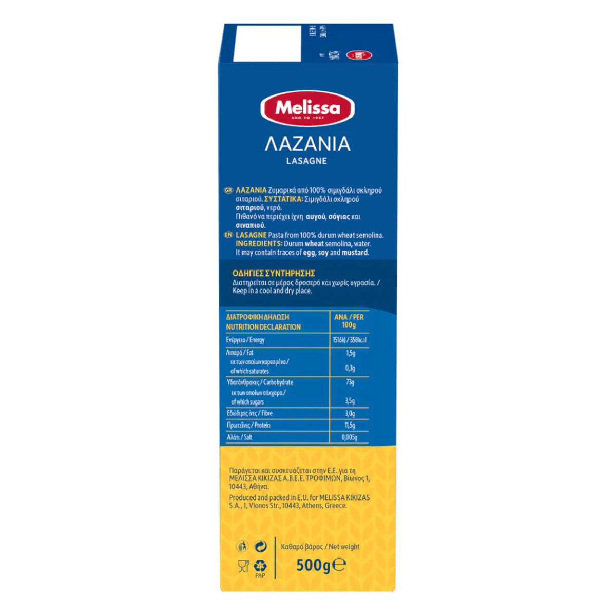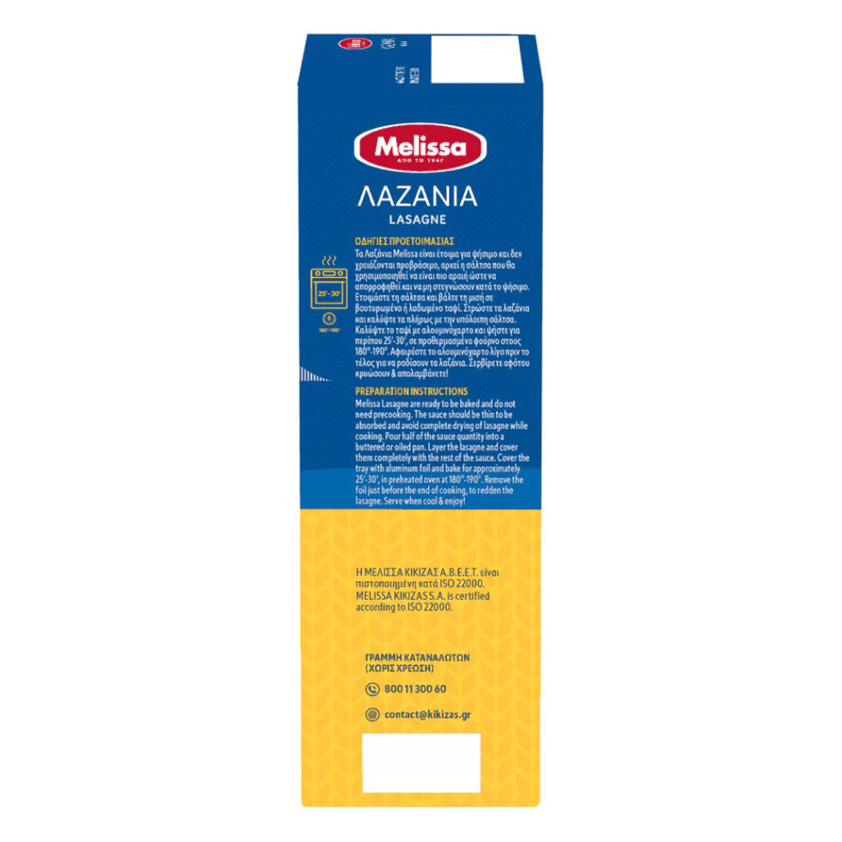 Τα Λαζάνια Melissa είναι έτοιμα για ψήσιμο και δεν χρειάζονται προβράσιμο, αρκεί η σάλτσα που θα χρησιμοποιηθέι να είναι πιο αραιή ώστε να απορροφηθεί και να μην στεγνώσουν κατά το ψήσιμο. Ετοιμάστε τη σάλτσα και βαλτε τη μισή σε βουτυρωμένο ή λαδωμένο ταψί. Στρώστε τα λαζάνια και καλύψτε τα πλήρως με την υπόλοιπη σάλτσα. Καλύψτε το ταψί με αλουμινόχαρτο και ψήστε για περίπου 25'-30', σε προθερμασμένο φούνο στους 180° - 190°. Αφαιρέστε το αλουμινόχαρτο λίγο πριν το τέλος γαι να ροδίσουν τα λαζάνια. Σερβίρετε αφότου κρυώσουν & απολαμβάνετε!