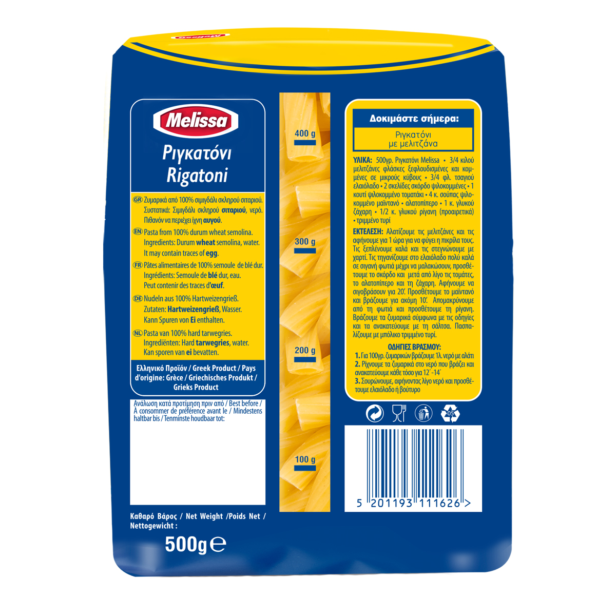 Το Ριγκατόνι Melissa παράγεται από εκλεκτά ελληνικά σιτάρια αποκτώντας χρυσαφένιο χρώμα και αυθεντική γεύση.