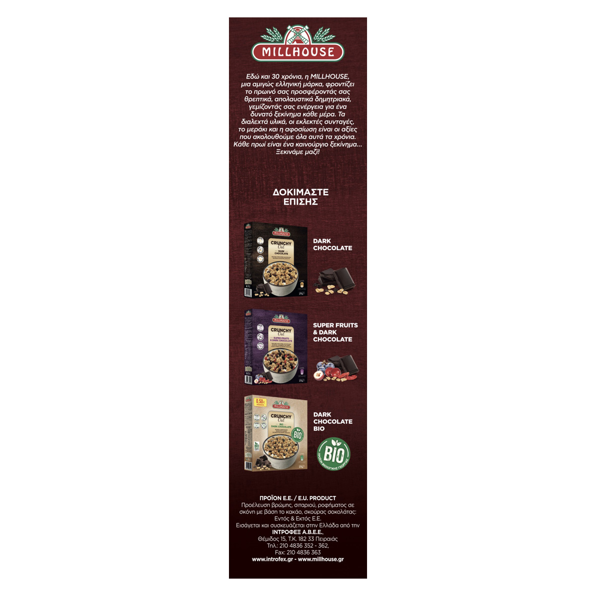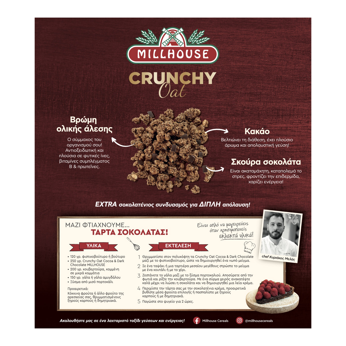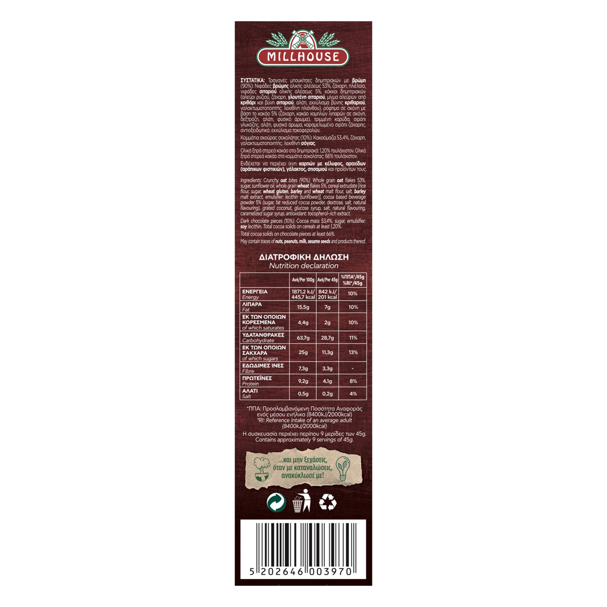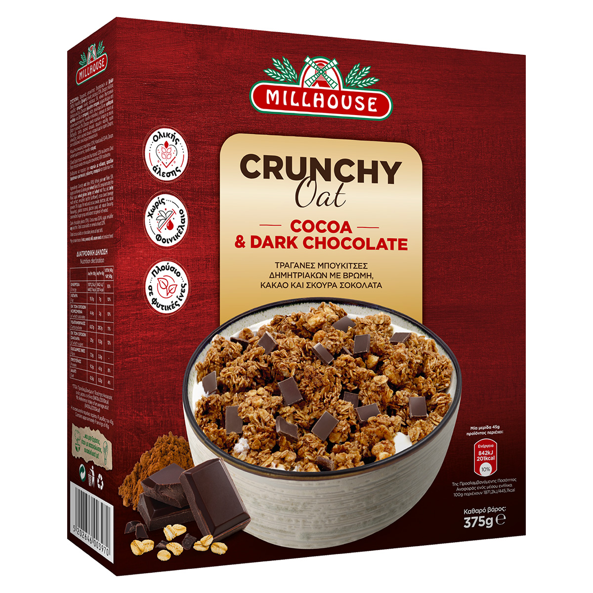 Το προϊόν Crunchy Oat Cocoa & Dark Dark Chocolate MILLHOUSE 375gr είναι τραγανές μπουκίτσες δημητριακών με βρώμη, κακάο και σκούρα σοκολάτα. Τα δημητριακά ολικής άλεσης αποτελούν πλούσια πηγή φυτικών ινών που βοηθούν στην ομαλή πεπτική λειτουργία και συμβάλλουν στο αίσθημα της πληρότητας αποτρέποντας την υπερκατανάλωση τροφής. Η βρώμη ολικής άλεσης είναι ο σύμμαχος του οργανισμού! Αντιοξειδωτική και πλούσια σε φυτικές ίνες, βιταμίνες συμπλέγματος Β και πρωτεΐνες. Η σκούρα σοκολάτα είναι ακαταμάχητη, καταπολεμά το στρες, φροντίζει την επιδερμίδα και χαρίζει ενέργεια!