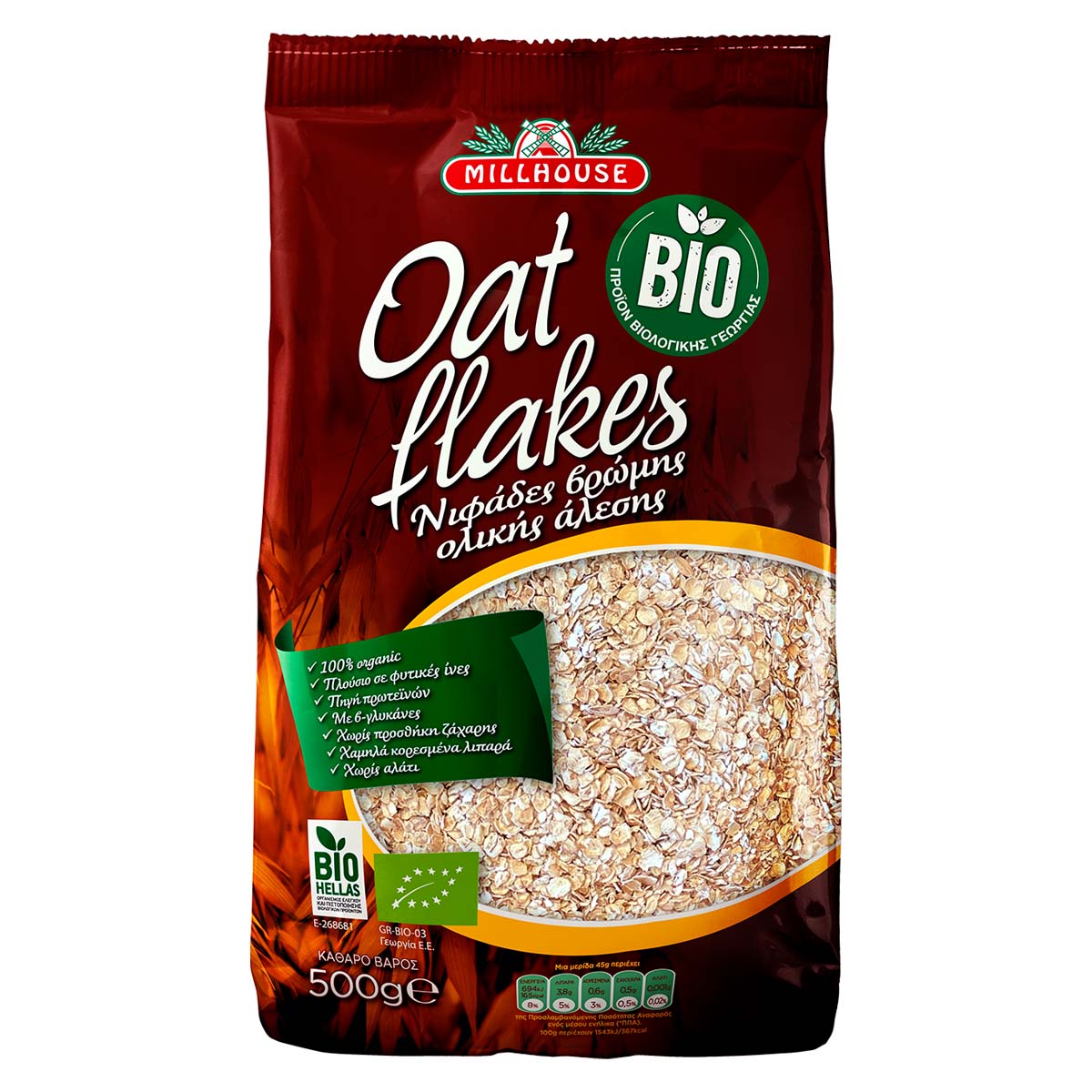 Το προϊόν Oat Flakes Bio MILLHOUSE 500gr είναι νιφάδες βρώμης ολικής άλεσης βιολογικής καλλιέργειας και είναι ένα 100% φυσικό προϊόν με πολλά οφέλη για την υγεία των ανθρώπων. Αποτελεί αναπόσπαστο κομμάτι μια υγιεινής διατροφής για όλες τις ηλικίες. Οι νιφάδες βρώμης BIO Millhouse αποτελούνται από συστατικά πολύ προσεκτικά και αυστηρά επιλεγμένα. Για το λόγο αυτό είμαστε βέβαιοι πως όλα τα υλικά προέρχονται από 100% βιολογική καλλιέργεια σύμφωνα με τους εν ισχύει διεθνείς κανονισμούς και κάθε στάδιο παραγωγής και επεξεργασίας τους συνοδεύεται από τα απαραίτητα πιστοποιητικά.