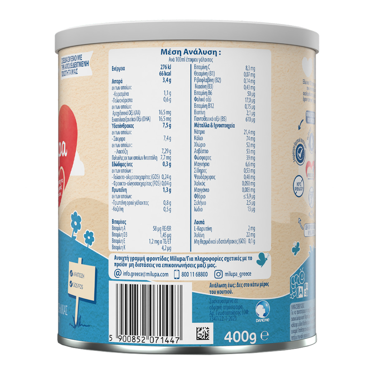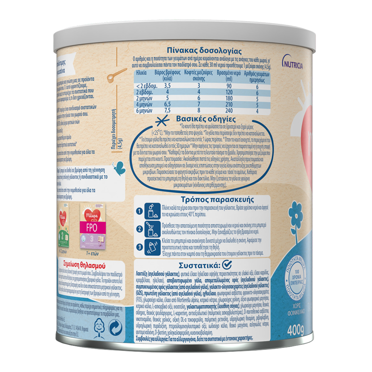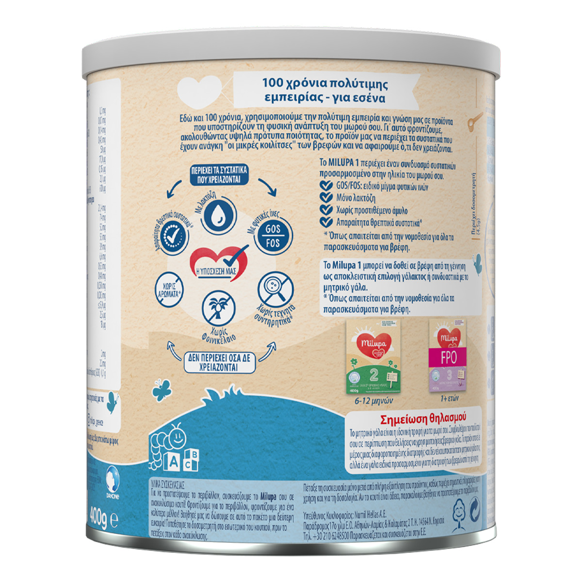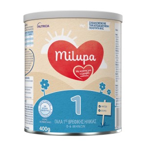 Το Milupa 1 είναι γάλα 1ης βρεφικής ηλικίας σε σκόνη. Είναι κατάλληλο για βρέφη από τη γέννηση όταν ο μητρικός θηλασμός δεν είναι εφικτός ή ως συμπλήρωμα του θηλασμού. Για περισσότερα από 90 χρόνια, χρησιμοποιούμε όλη την πολύτιμη εμπειρία και γνώση μας στα προϊόντα που ενισχύουν τη φυσική ανάπτυξη του μωρού σου. Γι'αυτό φροντίζουμε, ακολουθώντας υψηλά πρότυπα ποιότητας, το Milupa 1 να περιέχει ακριβώς ό,τι έχουν ανάγκη "οι μικρές κοιλίτσες" των βρεφών.