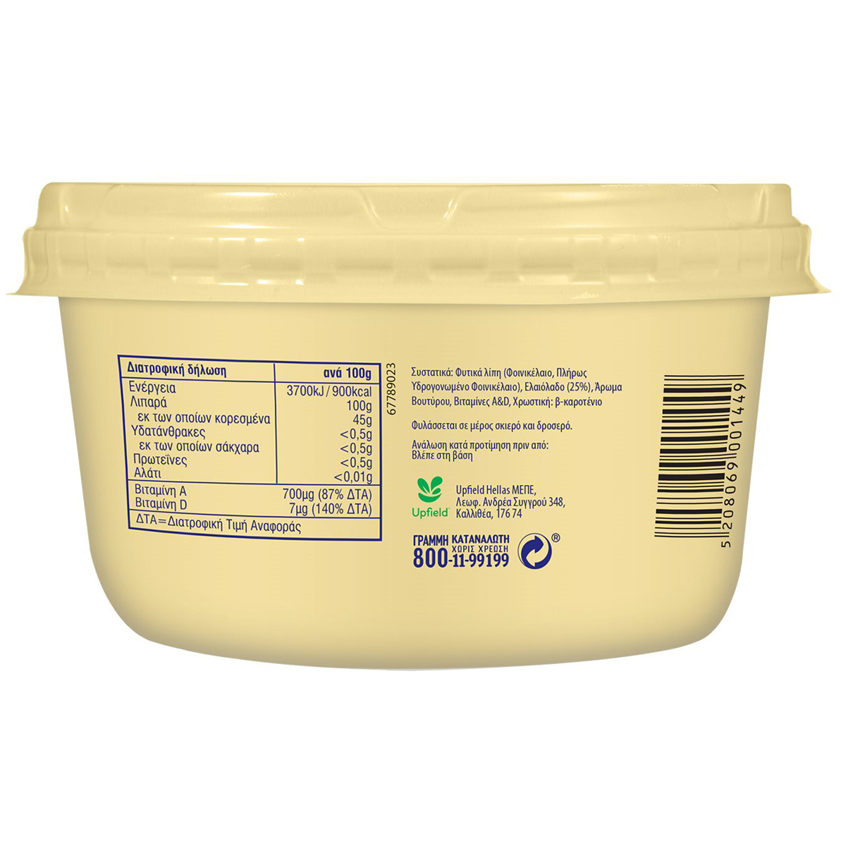 Φυτικά Λίπη (φοινικέλαιο, πλήρως υδρογονωμένο φοινικέλαιο), ελαιόλαδο (25%), άρωμα βουτύρου, βιταμίνες Α&D, χρωστική: β-καροτένιο.