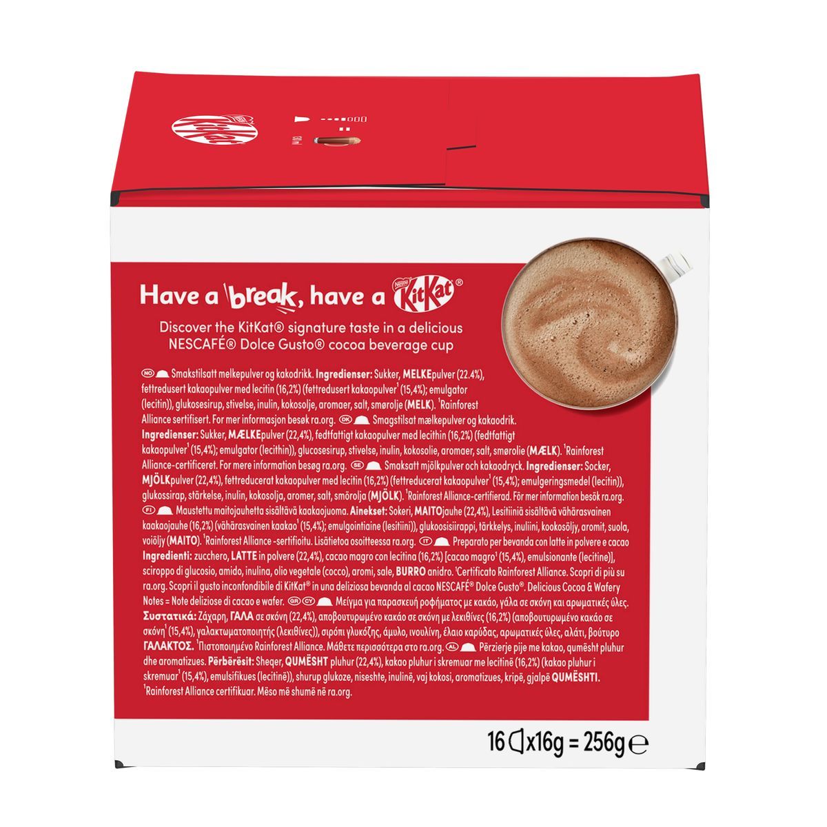 Μείγμα για παρασκευή ροφήματος με κακάο, γάλα σε σκόνη και αρωματικές ύλες. Κάνε ένα διάλειμμα, the coffee shop way, με το ζεστό ρόφημα NESCAFE® Dolce Gusto® KitKat® με κακάο. Δημιούργησε με αυτές τις κάψουλες με κακάο, ένα πεντανόστιμο ρόφημα με νότες γκοφρέτας και καραμέλας. Απόλαυσε τη χαρακτηριστική γεύση KitKat® στο σπίτι με ένα νέο τρόπο, μέσα σε μια λαχταριστή κούπα.