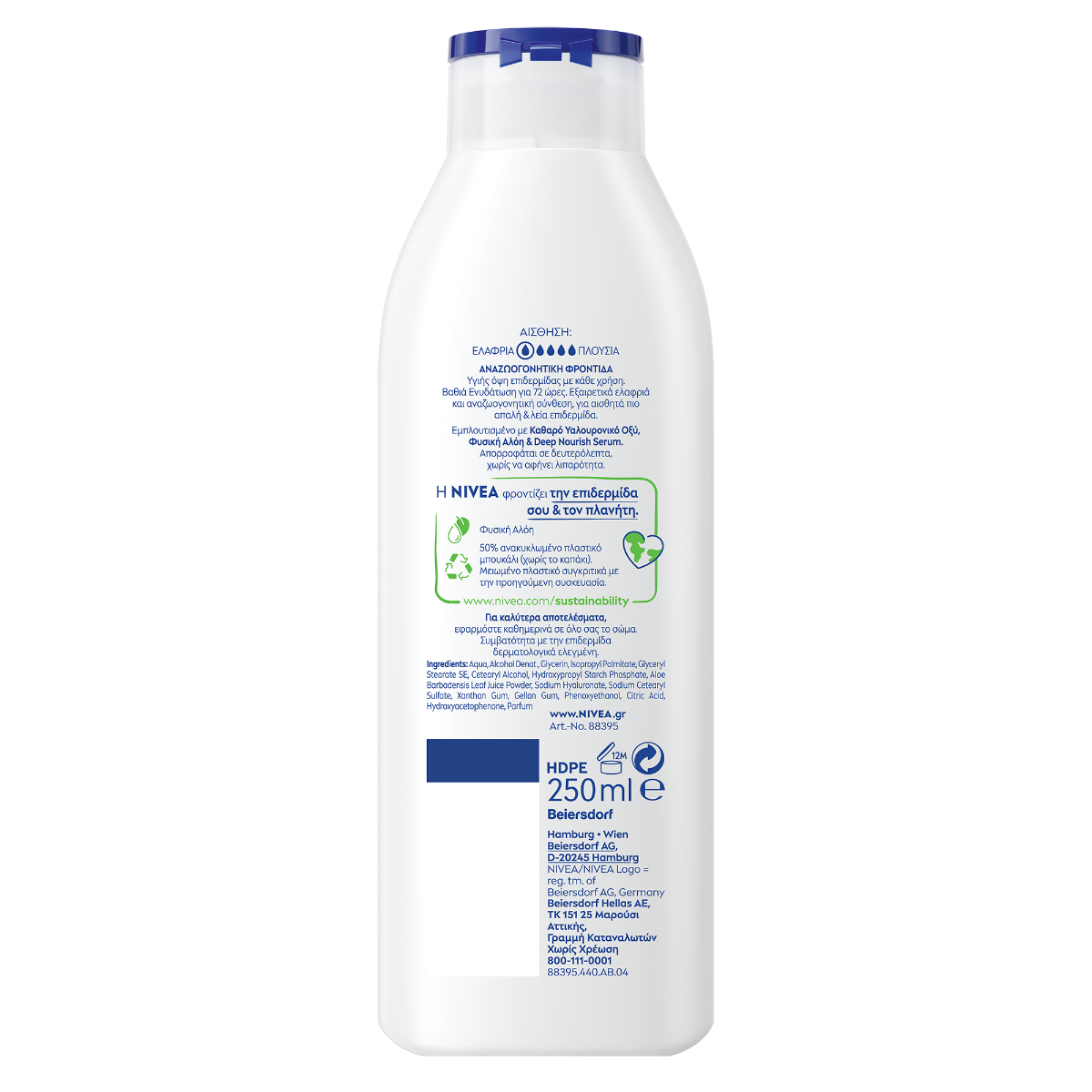 Η Λοσιόν Σώματος NIVEA Aloe & Hydration είναι εμπλουτισμένη με το DEEP MOISTURE SERUM και αλόη. Είναι κατάλληλη για κανονική και ξηρή επιδερμίδα, αφήνοντας την επιδερμίδα απαλή, ανανεωμένη και με υπέροχο άρωμα για 48 ώρες - από την 1η μόλις εφαρμογή. Τα συστατικά είναι προσεκτικά επιλεγμένα βάσει αυστηρών ποιοτικών προδιαγραφών και έχει συμβατότητα με την επιδερμίδα και είναι δερματολογικά εγκεκριμένη.