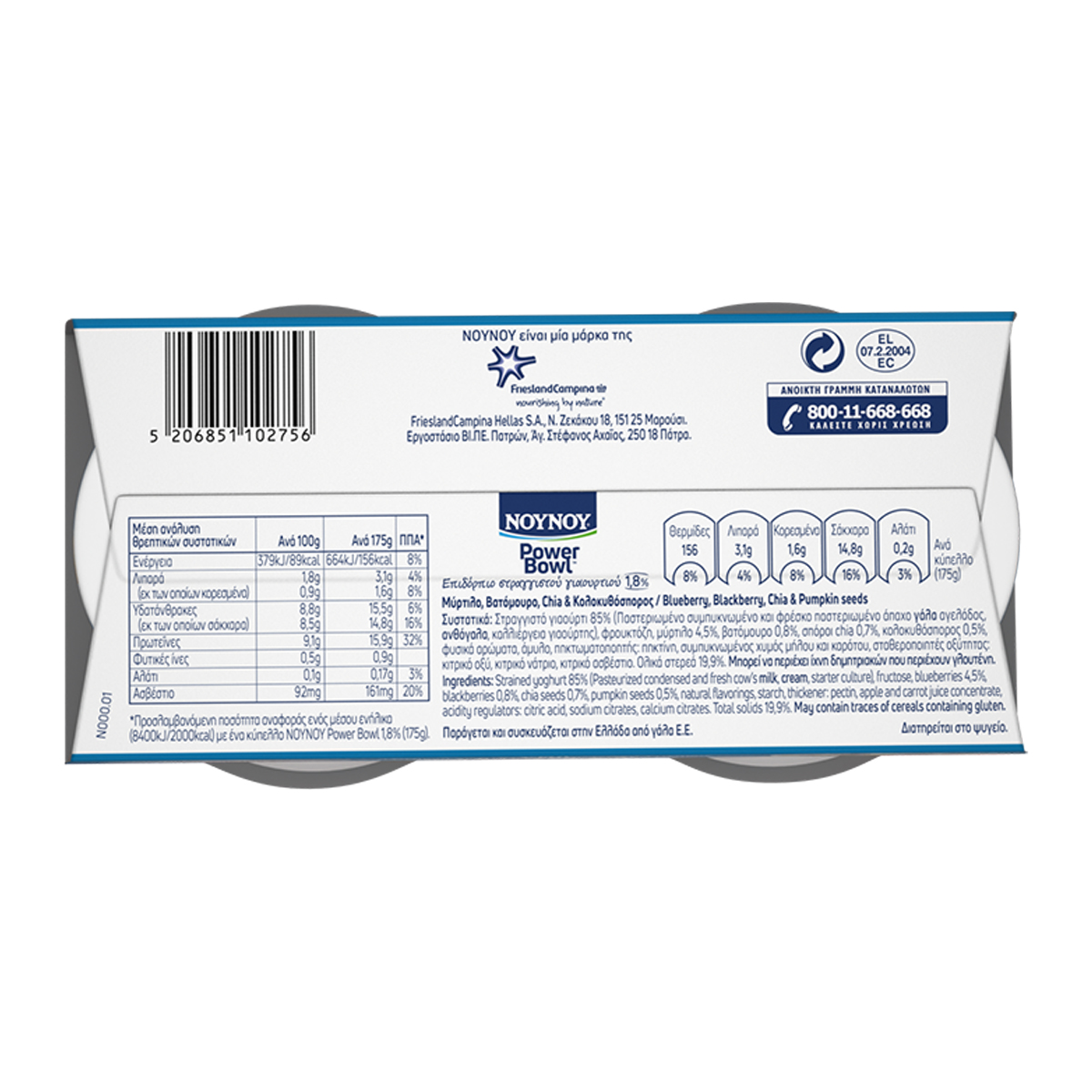 Νουνού Επιδόρπιο Στραγγιστού Γιαουρτιού Power Bowl Μύρτιλο Βατόμουρο Chia & Κολοκυθόσπορος 2 x 175 gr