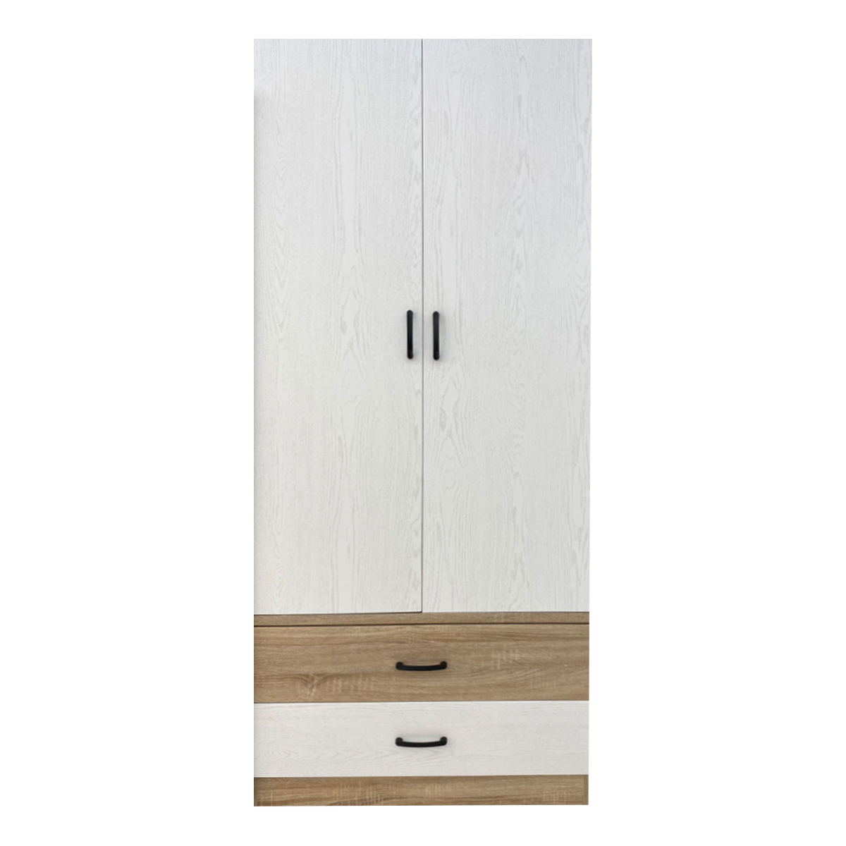 Ντουλάπα ξύλινη σε φυσικό χρώμα, με δύο φύλλα σε άσπρο χρώμα, μεταλλική ράγα για κρεμαστά ρούχα και δύο συρτάρια. Εξαιρετικής κατασκευής με μοντέρνο σχεδιασμό.