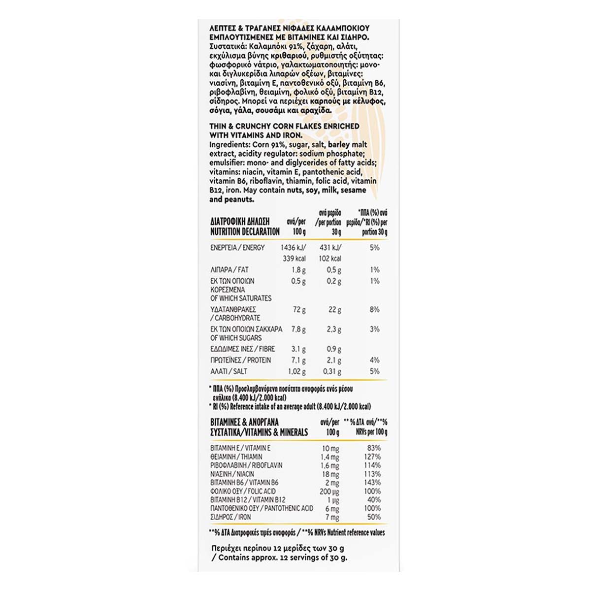 Καλαμπόκι 91%, ζάχαρη, αλάτι, εκχύλισμα βύνης ΚΡΙΘΑΡΙΟΥ, ρυθμιστής οξύτητας: φωσφορικό νάτριο, γαλακτωματοποιητής: μονο-και διγλυκερίδια λιπαρών οξέων, βιταμίνες: νιασίνη, βιταμίνη Ε, παντοθενικό οξύ, βιταμίνη Β6, ριβοφλαβίνη, θειαμίνη, φολικό οξύ, βιταμίνη Β12, σίδηρος.