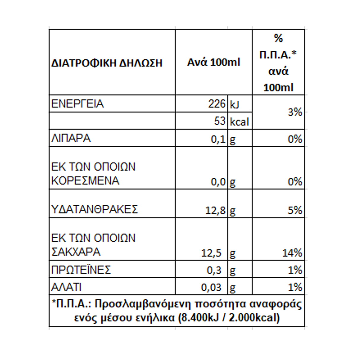 | Ενέργεια (ανά 100g) | 53 kcal |
