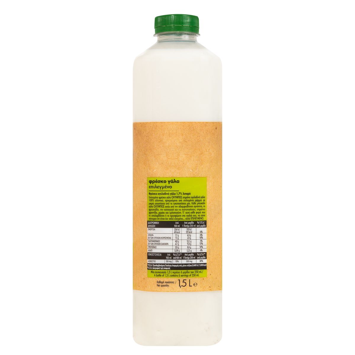 Το φρέσκο γάλα ΟΛΥΜΠΟΣ επιλεγμένο με λίπος 1,7% παράγεται από 100% ελληνικό φρέσκο γάλα.