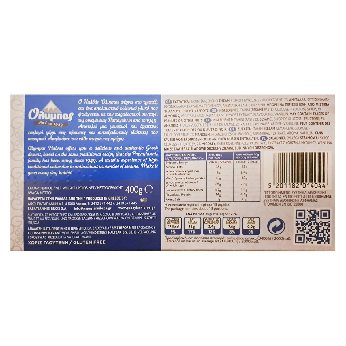 Ο χαλβάς “Όλυμπος” είναι ένα υπέροχο ελληνικό γλυκό που παράγεται από ταχίνι (αλεσμένο σουσάμι) και λευκή καραμέλα, συχνά και με προσθήκη ξηρών καρπών ή μελιού. Είναι ένα γλυκό με καθαρά φυτικά συστατικά και υψηλή θρεπτική αξία, ιδιαίτερα δημοφιλές στις παραδοσιακές νηστείες. Είναι όμως και το ιδανικό γλυκό μετά το γεύμα ή το δείπνο και με τον καφέ. Ο χαλβάς “Όλυμπος” είναι γευστικός, θρεπτικός, πλούσιος σε πρωτεΐνες και ασβέστιο που τον κάνουν άριστη, φυσική τροφή για όλους.