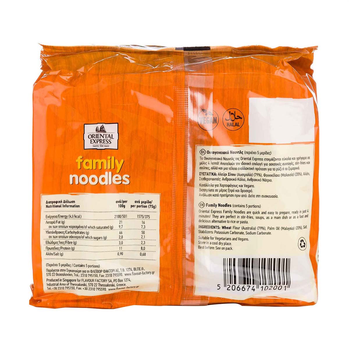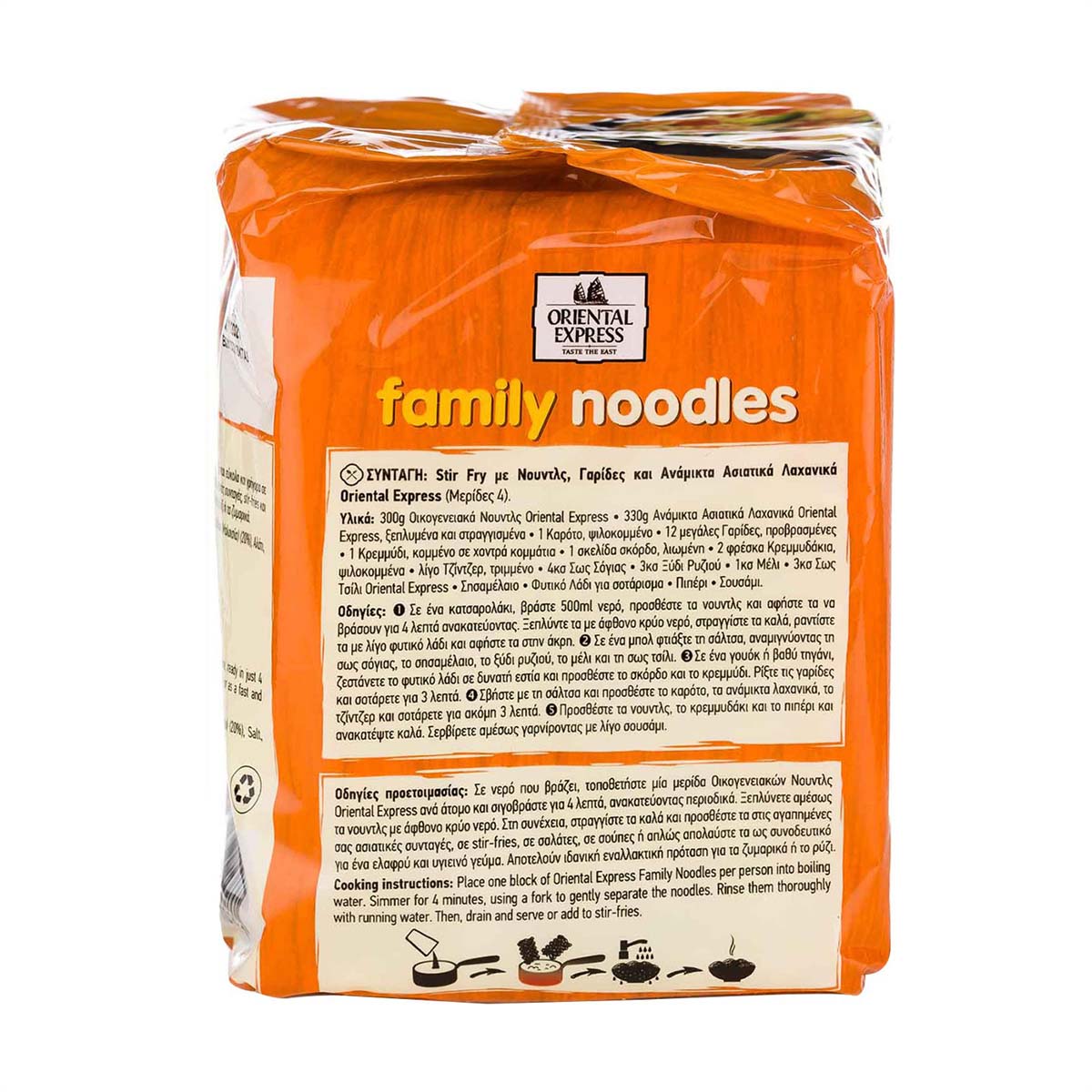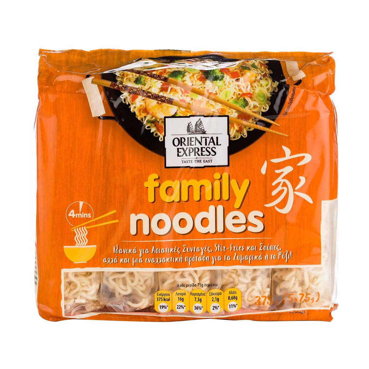 Τα νουντλς που θα λατρέψει όλη η οικογένεια! Σε εύχρηστη, μοντέρνα συσκευασία των 5 μερίδων για να μαγειρέψουμε τις πιο νόστιμες ασιατικές και όχι μόνο συνταγές! Τα νέα οικογενειακά νουντλς της Oriental Express ήρθαν για να γίνουν η νέα αγαπημένη συνήθεια όλης της οικογένειας! Ετοιμάζονται εύκολα και πολύ γρήγορα καθώς απαιτούν μόνο 4 μόνο λεπτά βράσιμο και μπορούν να χρησιμοποιηθούν για τις ασιατικές συνταγές μας και τα Stir Fry. Δοκιμάστε τα ακόμη μόνα τους, ή με κάποια ασιατική σως ως την τέλεια εναλλακτική για τα ζυμαρικά και το ρύζι!