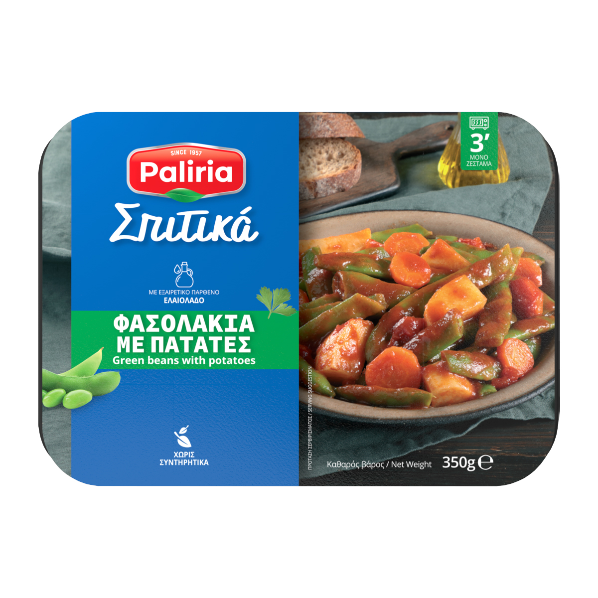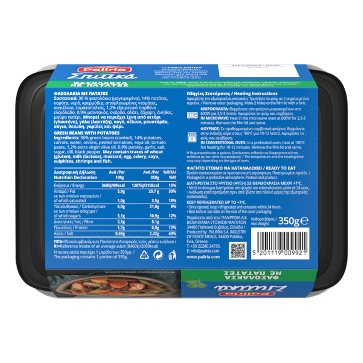 Τα Φασολάκια λαδερά με πατάτες Paliria είναι ένα ακόμη αγαπημένο πιάτο της ελληνικής κουζίνας που ξυπνάει μνήμες από τη μαγειρική της γιαγιάς. Τα φασολάκια λαδερά με πατάτες δεν θα μπορούσαν να λείπουν από τη σειρά ψυγείου της Paliria «Σπιτικά». Αποτελούν ιδανική επιλογή και για τους χορτοφάγους ή vegan. Για τη συνταγή φασολάκια λαδερά Paliria, επιλέγονται εκλεκτά πράσινα πλατιά φασολάκια, που σιγομαγειρεύονται μέσα σε μια λαχταριστή σάλτσα τομάτας, αρωματισμένης με μπόλικο κρεμμυδάκι. Φρέσκο ψωμί –κατά προτίμηση ζυμωτό- κι ένα λευκό τυρί, όπως φέτα, μανούρι ή μυζήθρα κάνουν εξαιρετική παρέα στο νόστιμο και ζουμερό αυτό πιάτο, που τρώγεται εξίσου ευχάριστα και ως γεύμα και ως δείπνο. Από το ψυγείο, του σουπερμαρκετ, οι ατομικές μερίδες με τα λαχταριστά Φασολάκια λαδερά με πατάτες, μπορούν να περάσουν απευθείας σε οποιοδήποτε τραπέζι και να φαγωθούν σε θερμοκρασία δωματίου, ή ζεσταμένα, ανάλογα με την προτίμηση.
