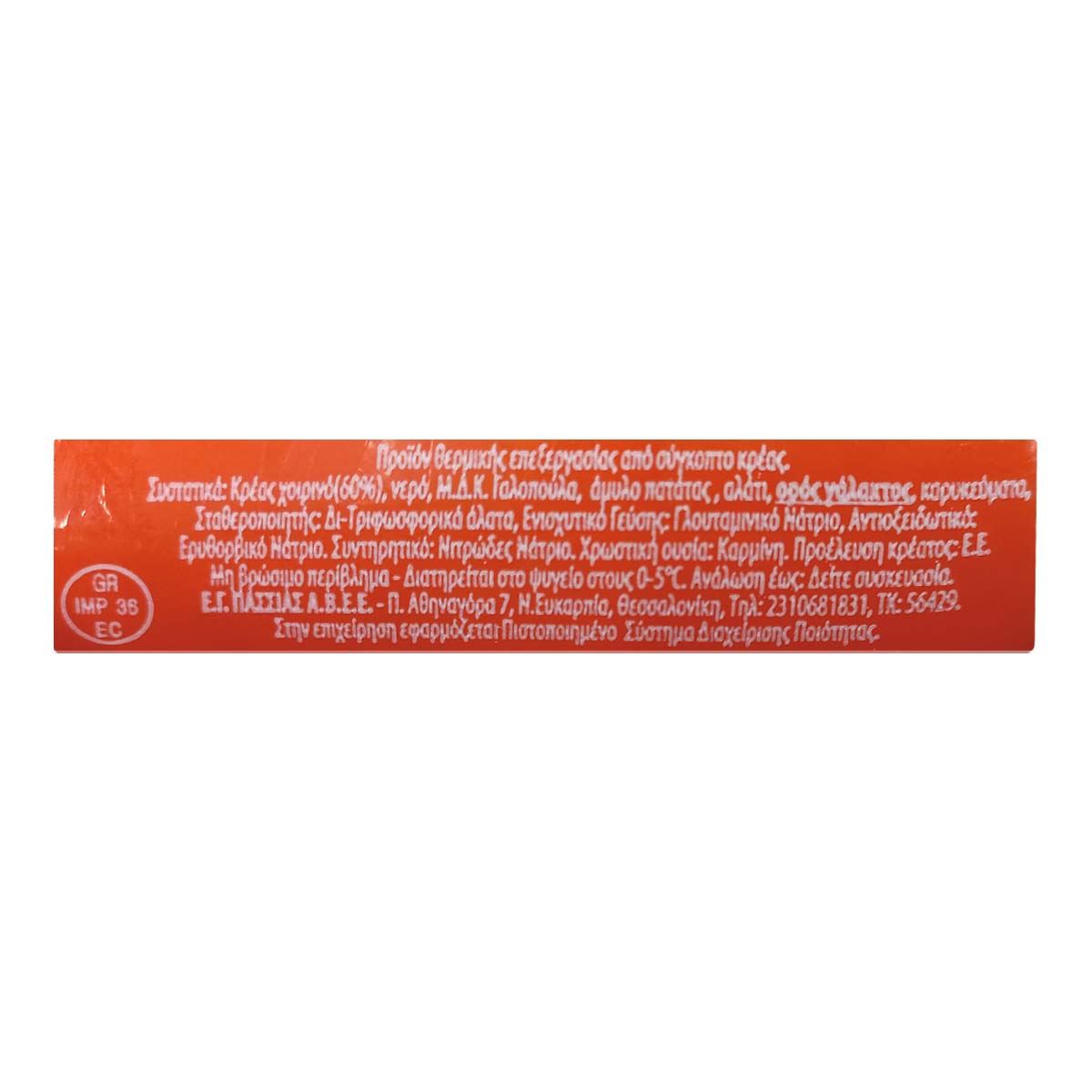 Κρέας χοιρινό (60%), νερό, Μ.Δ.Κ. γαλοπούλα, άμυλο πατάτας, αλάτι, ΟΡΟΣ ΓΑΛΑΚΤΟΣ, καρυκεύματα, σταθεροποιητής: Δι-τριφωσφορικά άλατα, ενισχυτικό γεύσης: γλουταμινικό νάτριο, αντιοξειδωτικά: ερυθορβικό νάτριο. Συντηρητικό: νιτρώδες νάτριο, χρωστική ουσία: καρμίνη. Προέλευση κρέατος: Ε.Ε.