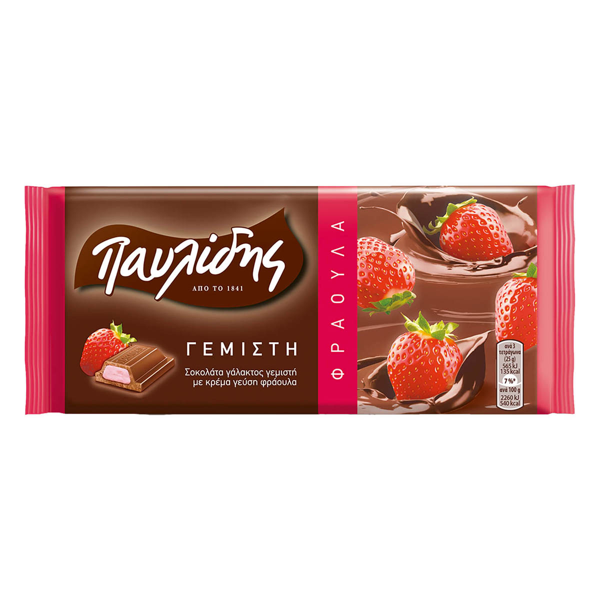 Απολαυστική σοκολάτα γάλακτος γεμιστή με κρέμα φράουλα! Δώστε στη μέρα σας τη γεύση που επιθυμείτε με μία σοκολάτα γάλακτος Παυλίδης γεμιστή!