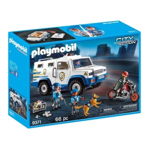 Ξεκινήστε μια περιπέτεια καταδίωξης κακοποιών με το φανταστικό PLAYMOBIL Όχημα χρηματαποστολής. Κατά τη διάρκεια της τολμηρής ληστείας του οχήματος, ένας απατεώνας επιχειρεί να αρπάξει τα χρήματα και να δραπετεύσει με τη γρήγορη μοτοσικλέτα του. Η μια φιγούρα μπορεί να μεταμορφωθεί σε κλέφτη περιστρέφοντας το κεφάλι του. Η οροφή του οχήμαυος είναι αποσπώμενη και οι πίσω πόρτες του ανοίγουν. Περιεχόμενα: τέσσερις φιγούρες PLAYMOBIL, σκυλί με λουρί, φορτηγό με χρήματα, μοτοσυκλέτα, κουτί με καπάκι, δύο τουφέκια, τέσσερα πιστόλια, τρείς θήκες για πιστόλια, χειροπέδες, έξι χαρτονομίσματα, τρείς ράβδοι χρυσού, δύο κράνη με προσωπίδες, ραδιόφωνο, μπερές, τρία προστατευτικά γιλέκα, κουβέρτα σκύλου, ρολόι χειρός.