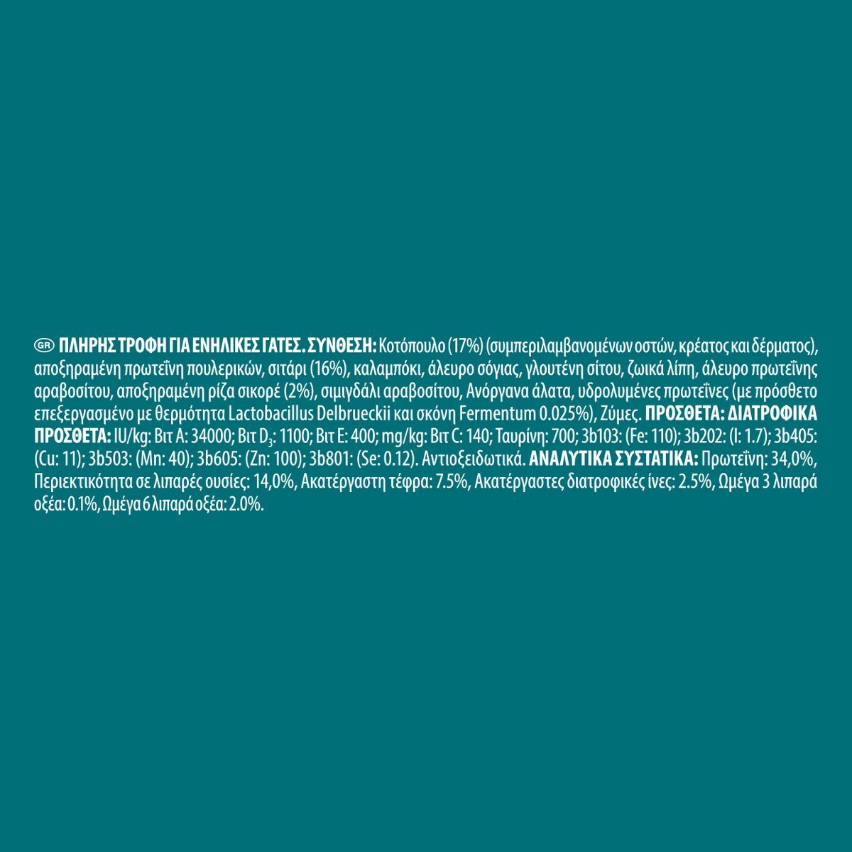 Πλήρης τροφή για ενήλικες γάτες Purina ONE Adult cat, Πλούσιο σε Κοτόπουλο και Δημητριακά Ολικής Άλεσης 1,5kg. Η PURINA ONE ADULT έχει ένα διατροφικό προφίλ ειδικά σχεδιασμένο για γάτες ενός έτους και πάνω. Το ισορροημένο μικρωβίωμα του εντέρου είναι απαραίτητο για την καλή υγεία της γάτας σας. Έχει άμεσο αντίκτυπο στο ανοσοποιητικό της σύστημα. Το μικροβίωμα είναι ένα οικοσύστημα που περιέχει τρισεκατομμύρια μικροοργανισμούς που ζουν στο έντερο και είναι μοναδικοί σε κάθε γάτα. Η ισορροπία των μικροοργανισμών είναι σημαντική για να έχει θετική επίδραση στην πεπτική υγεία, το ανοσοποιητικό σύστημα και τη γενική ευεξία της γάτας. Η PURINA ONE BIFENSIS® είναι μια μοναδική διατροφική σύνθεση με ωφέλιμα λειτουργικά βακτήρια τα οποία είναι επιστημονικά αποδεδειγμένο ότι ενισχύουν τη φυσική άμυνα της γάτας σας από μέσα προς τα έξω. Η PURINA ONE BIFENSIS® περιέχει, μαζί με τα λειτουργικά βακτήρια, όλα τα βασικά συστατικά που χρειάζεται η γάτα σας, περιλαμβανομένων των λιπαρών οξέων Ωμέγα 6.
