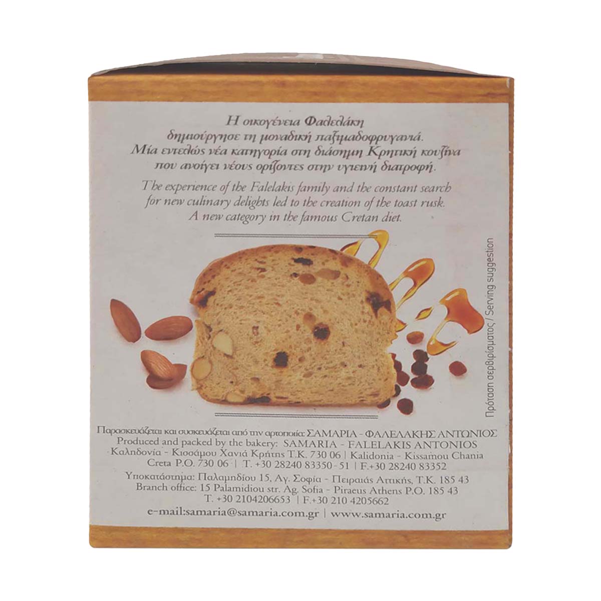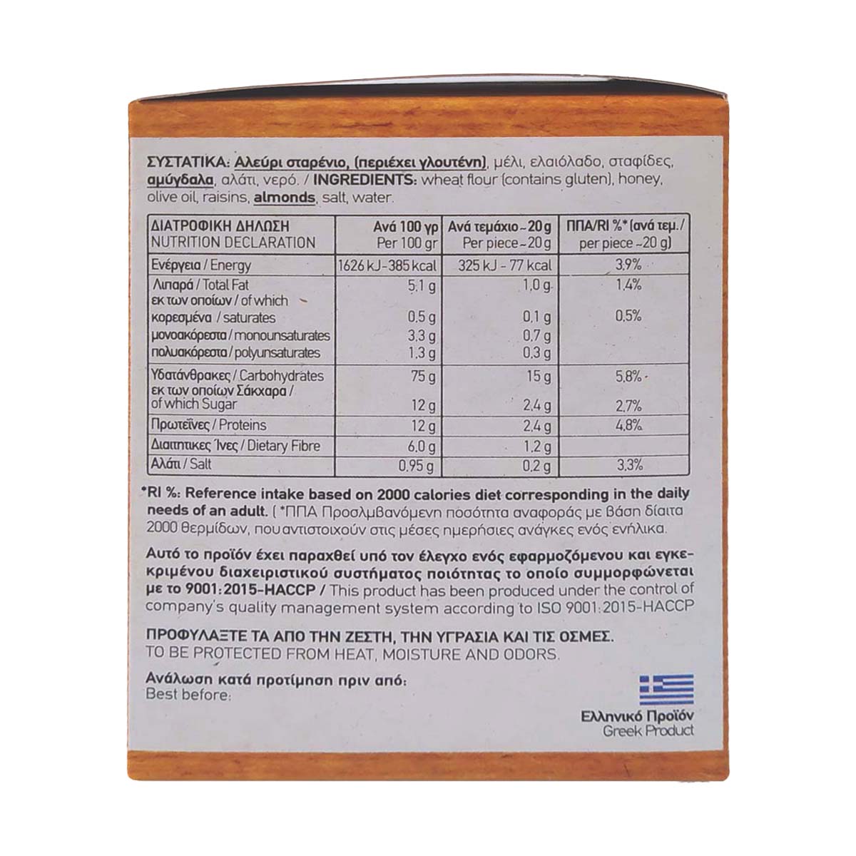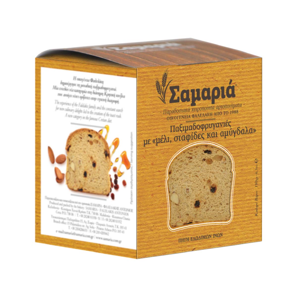 Κρητική Παραδοσιακή Χειροποίητη Παξιμαδοφρυγανια με Μέλι Σταφίδες και Αμύγδαλα. Ένας υπέροχος συνδυασμός αγνών και Κρητικών πρώτων υλών, υψηλής διατροφικής αξίας και ακαταμάχητης γεύσης! Διπλοφουρνιστες Παξιμαδοφρυγανιες πλούσιες σε βιταμίνες, λόγω των φυτικών ινών που περιέχουν και ιδανικές για μια ισορροπημένη διατροφή χαμηλή σε λιπαρά, καθώς δεν περιέχουν πρόσθετα σάκχαρα.