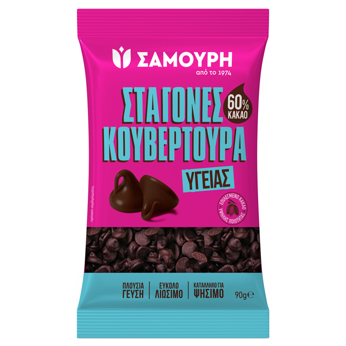 Οι Σταγόνες Κουβερτούρα Υγείας 60% κακάο ΣΑΜΟΥΡΗ λιώνουν εύκολα σε μπεν μαρί για πλούσια γεύση, για επικάλυψη σε τούρτες, muffins, cupcakes, cakepops, donuts, κέικ, ψήνονται (μέχρι 15’) μέσα σε ζύμες για λαχταριστά cupcakes, μπισκότα, cookies και είναι ιδανικές για να διακοσμήσετε κάθε γλυκό που θα σας οδηγήσει το... ζαχαροπλαστικό σας ένστικτο να δημιουργήσετε.