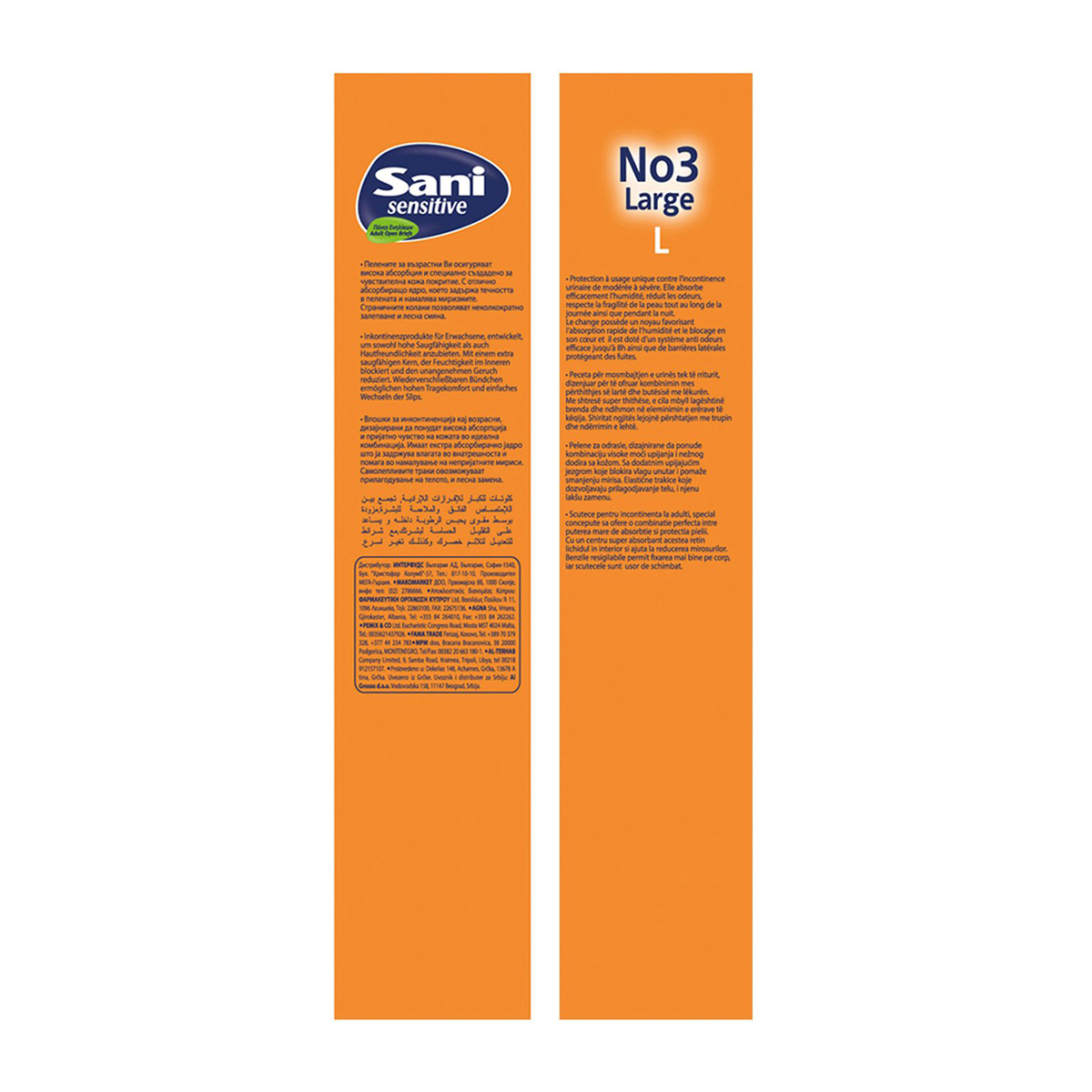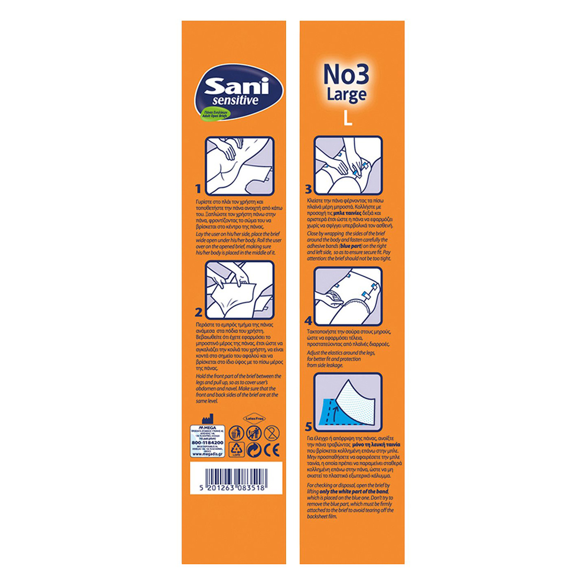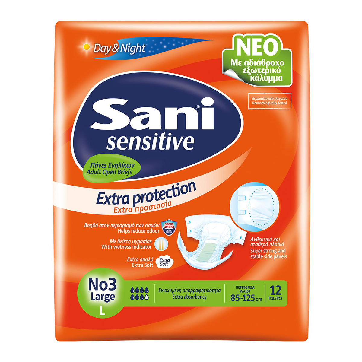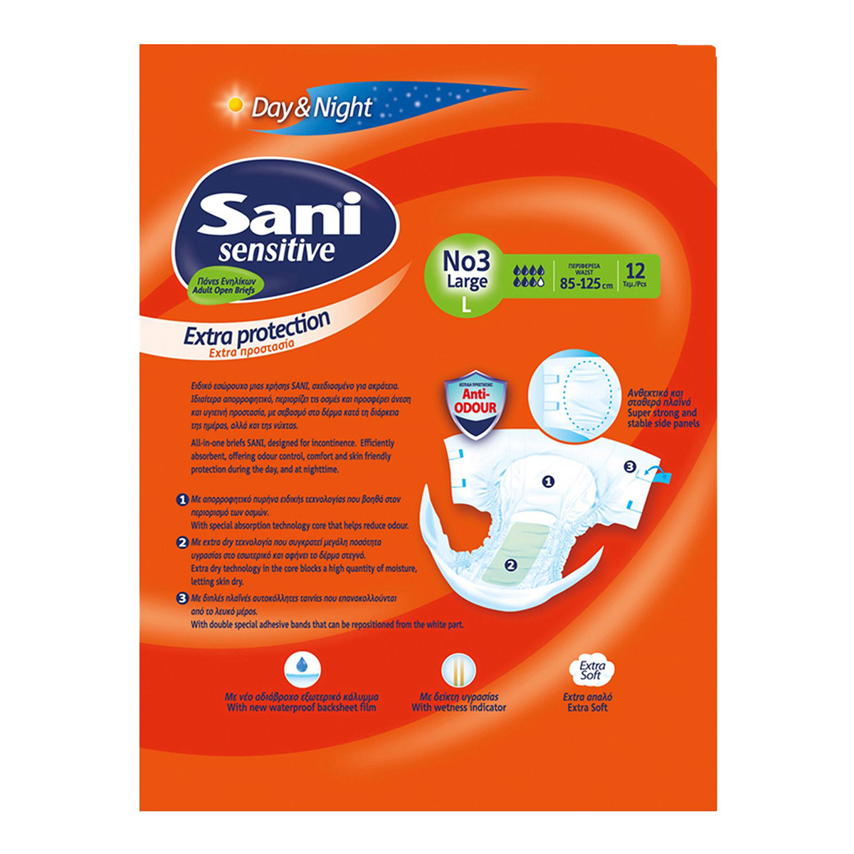 Ανοιχτές πάνες ακράτειας Sani Sensitive. Ενδείκνυνται για περιπτώσεις βαριάς μορφής ακράτειας. Με σχεδιασμό Day & Night που προσφέρει υψηλή απορροφητικότητα και υγιεινή προστασία, τόσο κατά τη διάρκεια της ημέρας, όσο και της νύχτας. Με ειδική τεχνολογία Odour Control για αποτελεσματικό περιορισμό των οσμών. Διαθέτουν δείκτη υγρασίας και ειδικές πλαϊνές ταινίες που επανακολούνται. Για διαστάσεις περιφέρειας μέσης : 85-125cm. Δερματολογικά ελεγμένες. Σε συσκευασία των 12 τεμαχίων.