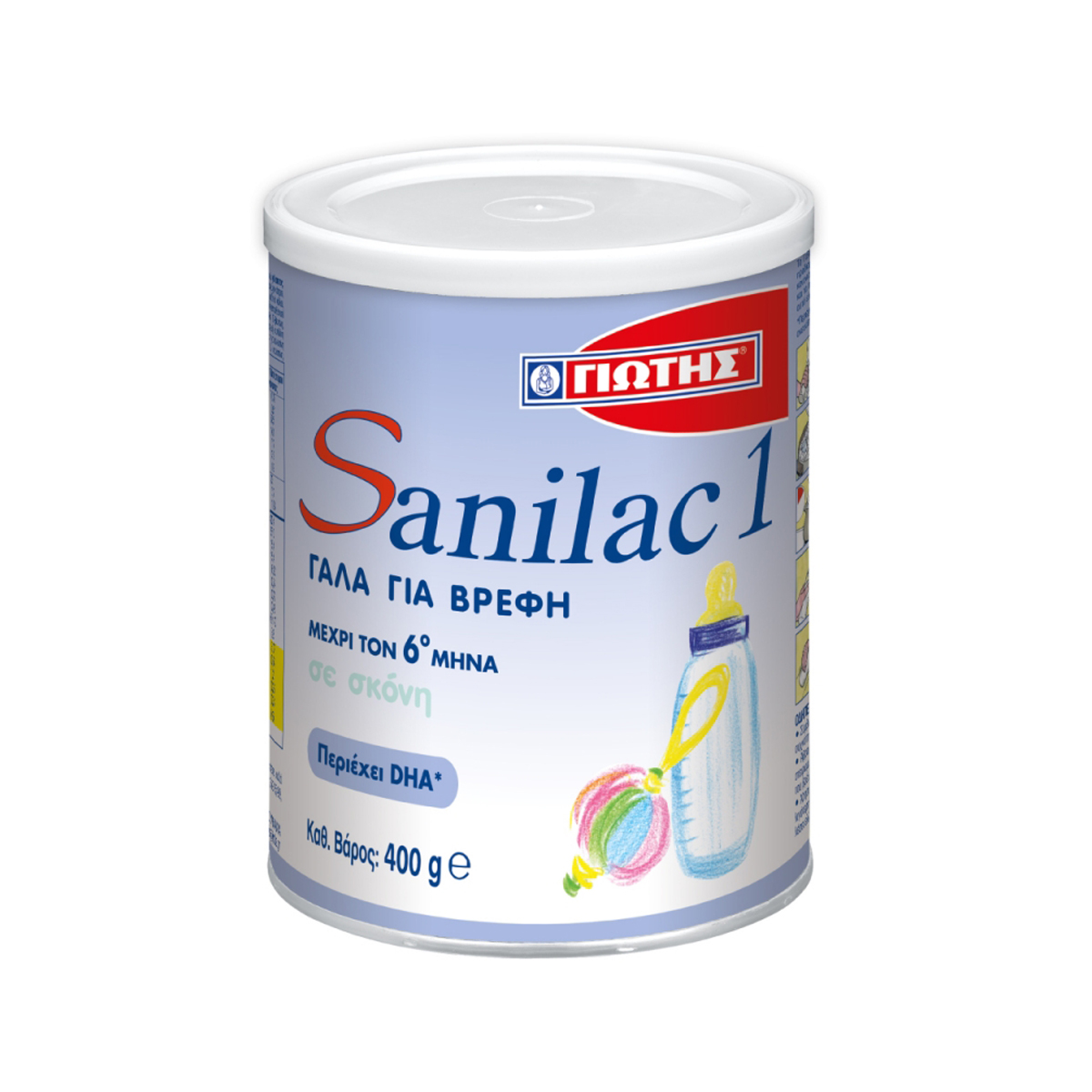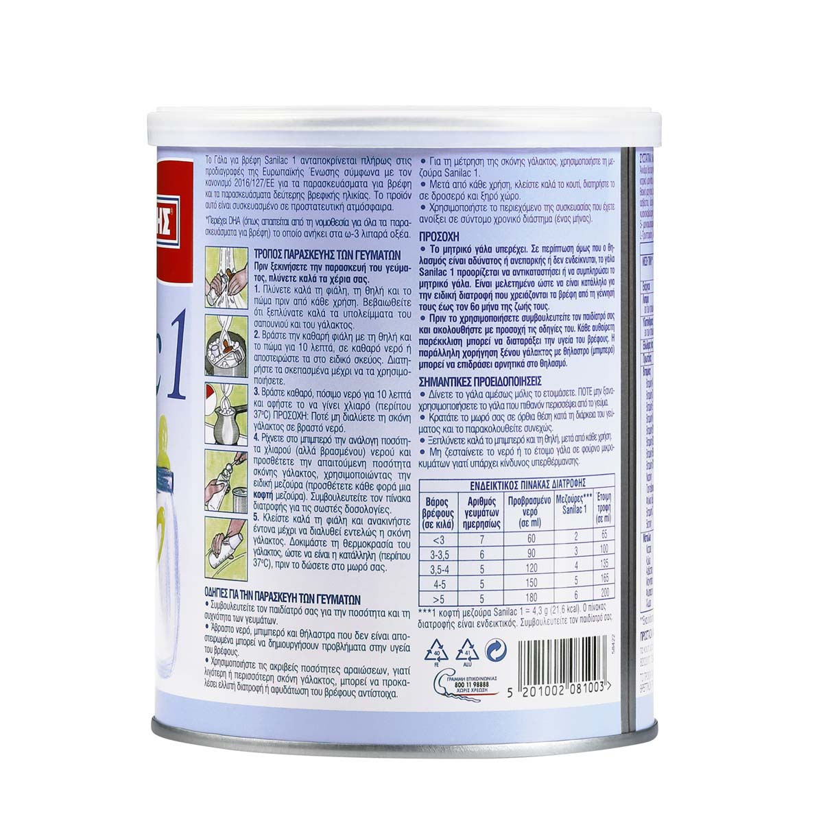 ΜΕΧΡΙ ΤΟΝ 6ο ΜΗΝΑ με πρεβιοτικές ίνες, πολυακόρεστα λιπαρά οξέα μακράς αλύσου (LC-PUFAS) νουκλεοτίδια. Το Γάλα για βρέφη Sanilac 1 ανταποκρίνεται πλήρως στις προδιαγραφές της Ευρωπαϊκής Ένωσης σύμφωνα με την οδηγία 2006/141/ΕΕ για τα παρασκευάσματα για βρέφη και τα παρασκευάσματα δεύτερης βρεφικής ηλικίας. Το Γάλα για Βρέφη Sanilac 1 χαρακτηρίζεται από: Αναλογία Ορού/Καζεΐνη: 60/40 - Αναλογία Ca/Ρ:1,6 - Αποκλειστική χρήση Λακτόζης. Η σύνθεση του Sanilac 1 είναι εμπλουτισμένη με σίδηρο. Με προσθήκη: Πολυακόρεστων λιπαρών οξέων μακράς αλύσου (LC-ΡUFΑS), ταυρίνης, πρεβιοτικών ινών (γαλακτο- ολιγοσακχαρίτες), νουκλεοτιδίων. Το προϊόν αυτό είναι συσκευασμένο σε προστατευτική ατμόσφαιρα.
