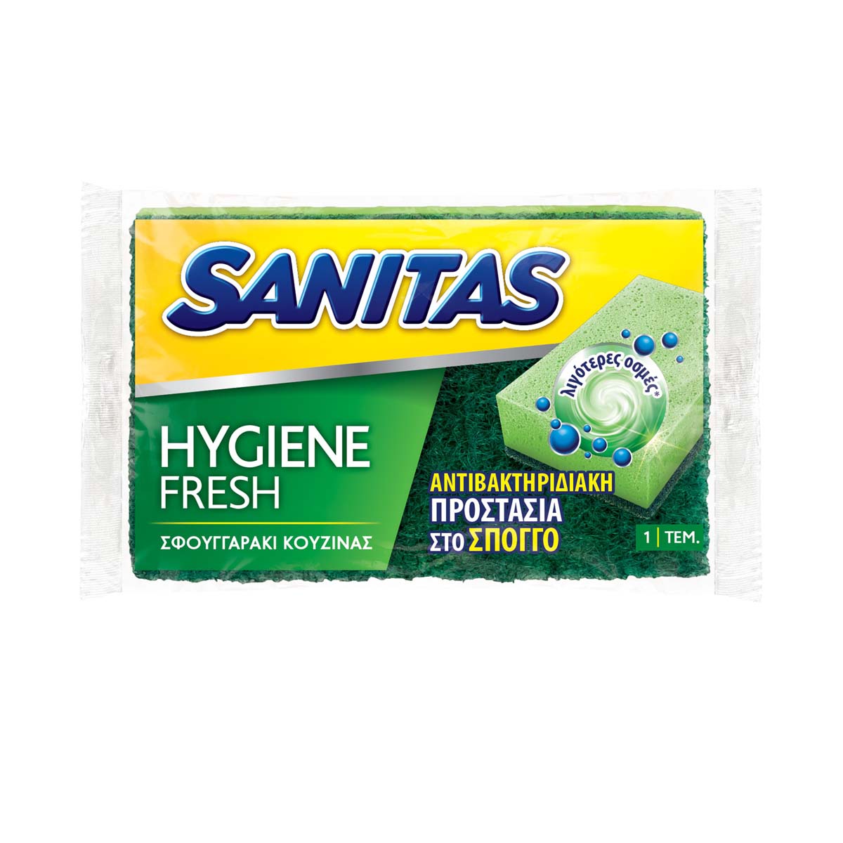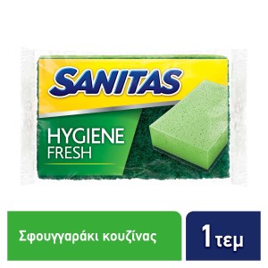 To αντιβακτηριδιακό σφουγγάρι κουζίνας Sanitas Hygiene Fresh με το χαρακτηριστικό πράσινο χρώμα, διαθέτει αντιβακτηριδιακή προστασία στο σπόγγο ενώ ταυτόχρονα μειώνει τις οσμές που οφείλονται στα βακτήρια. Είναι ιδανικό για το καθημερινό πλύσιμο όλων των σκευών (πιάτα, ποτήρια, κατσαρόλες κ.α) απομακρύνοντας και τους πιο επίμονους λεκέδες 1τεμ Προστασία από την ανάπτυξη βακτηριδίων στο σπόγγο Μειώνει τις οσμές από τα βακτήρια στο σφουγγάρι Για καθαριότητα και υγιεινή Μεγάλης διάρκειας Κατάλληλο για όλα τα σκεύη.