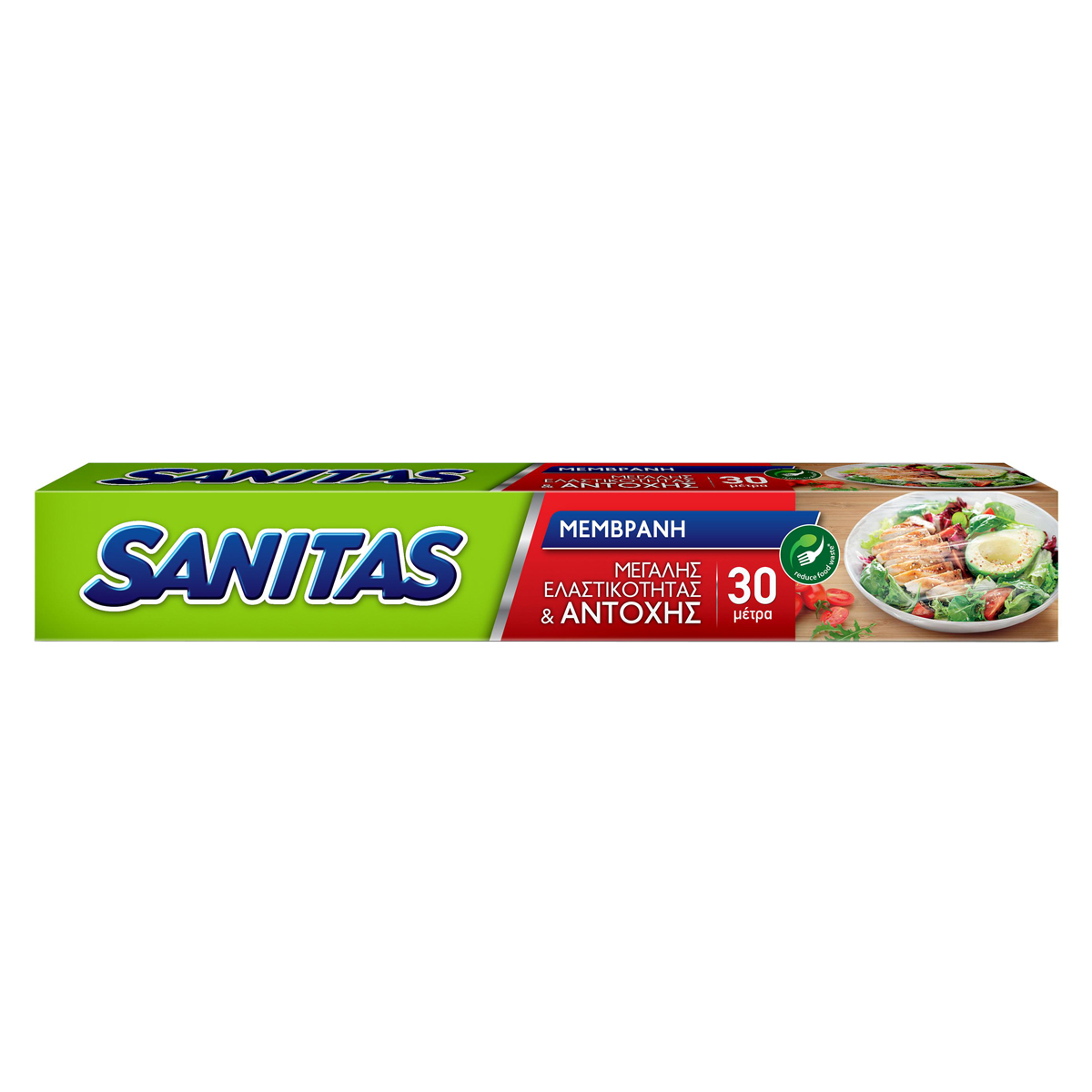 Η μεμβράνη Sanitas είναι υψηλής ελαστικότητας και αντοχής, ιδανική για συντήρηση των τροφίμων μέσα και έξω από το ψυγείο! Χάρη στη μεγάλη ελαστικότητά της εφαρμόζει εύκολα σε όλα τα σκεύη, εμποδίζοντας τη μεταφορά οσμών μεταξύ των τροφίμων. Είναι πολύ πρακτική στη χρήση, καθώς κόβεται εύκολα με ένα τράβηγμα για να τυλίξετε το σκεύος ή φαγητό που επιθυμείτε. -Υψηλής ελαστικότητας και αντοχής για τέλεια εφαρμογή -Πρακτική στη χρήση -Ιδανική για συντήρηση των τροφίμων μέσα και έξω από το ψυγείο -Κατάλληλη χρήση στην κατάψυξη σε θερμοκρασίες έως -30 °C -Εμποδίζει τη μεταφορά των οσμών μεταξύ των τροφίμων -Κατάλληλη για μακροχρόνια επαφή με όλα τα τρόφιμα.