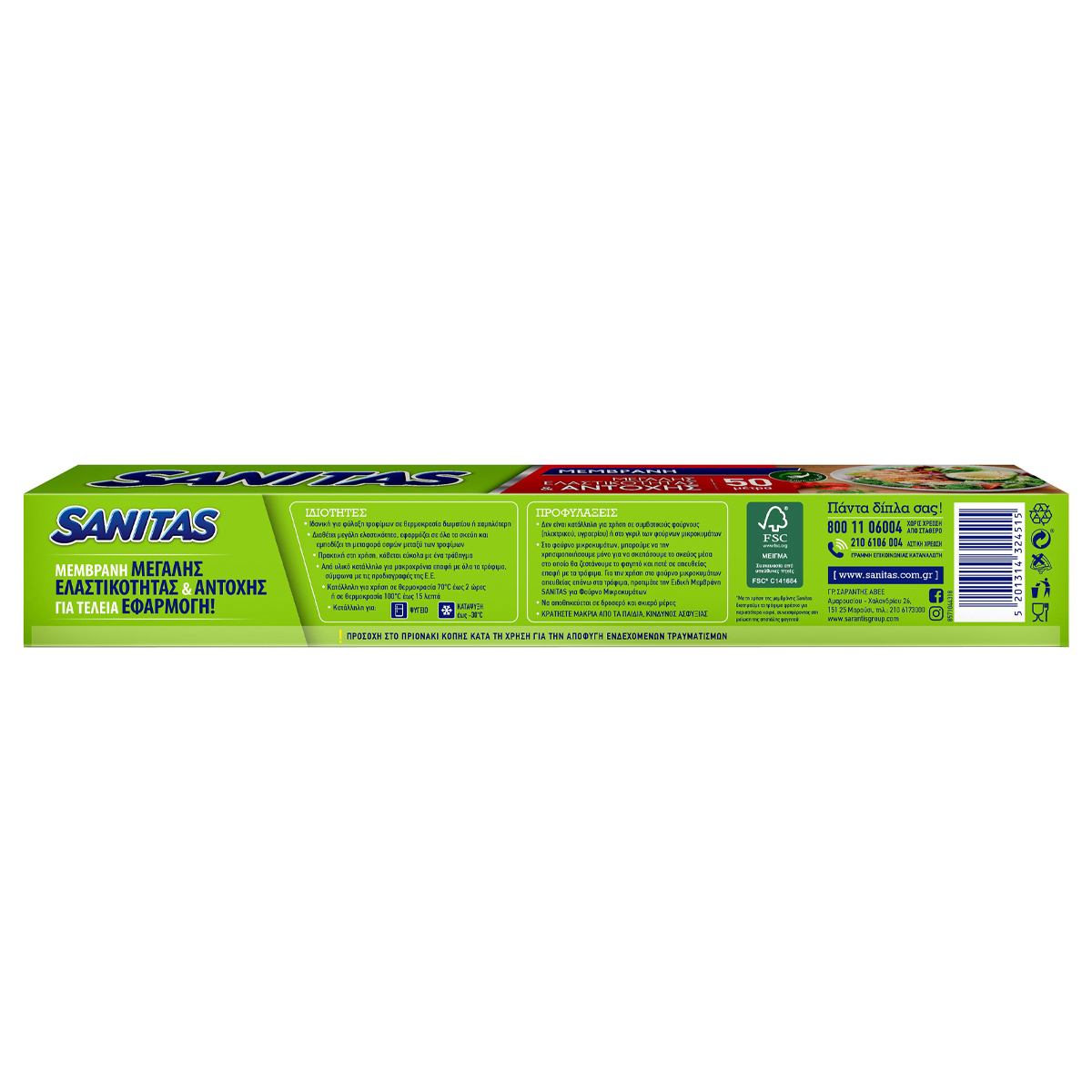 Η μεμβράνη Sanitas είναι υψηλής ελαστικότητας και αντοχής, ιδανική για συντήρηση των τροφίμων μέσα και έξω από το ψυγείο! Χάρη στη μεγάλη ελαστικότητά της εφαρμόζει εύκολα σε όλα τα σκεύη, εμποδίζοντας τη μεταφορά οσμών μεταξύ των τροφίμων. Είναι πολύ πρακτική στη χρήση, καθώς κόβεται εύκολα με ένα τράβηγμα για να τυλίξετε το σκεύος ή φαγητό που επιθυμείτε. -Υψηλής ελαστικότητας και αντοχής για τέλεια εφαρμογή -Πρακτική στη χρήση -Ιδανική για συντήρηση των τροφίμων μέσα και έξω από το ψυγείο -Κατάλληλη χρήση στην κατάψυξη σε θερμοκρασίες έως -30 °C -Εμποδίζει τη μεταφορά των οσμών μεταξύ των τροφίμων -Κατάλληλη για μακροχρόνια επαφή με όλα τα τρόφιμα.