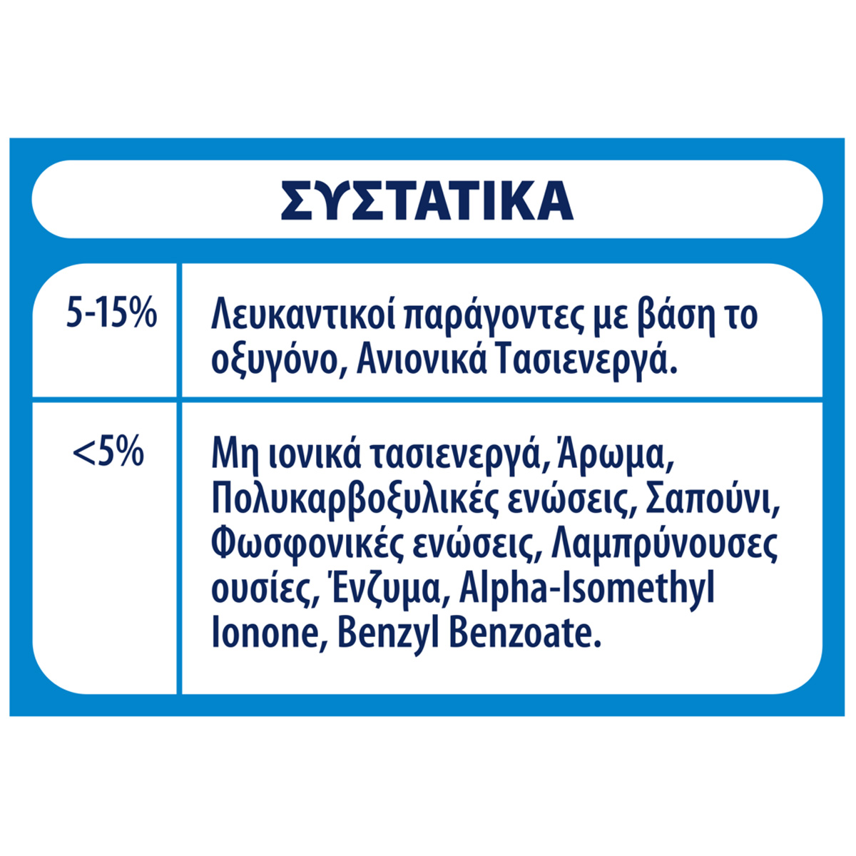 5-15% ανιονικά τασιενεργά, λευκαντικοί παράγοντες με βάση το οξυγόνο, <5% ένζυμα, μη ιονικά τασιενεργά, λαμπρύνουσες ουσίες, άρωμα, φωσφονικές ενώσεις, πολυκαρβοξυλικές ενώσεις, σαπούνι, ζεόλιθοι, Butylphenyl Methylpropional, Geraniol, Hexyl Cinnamal.