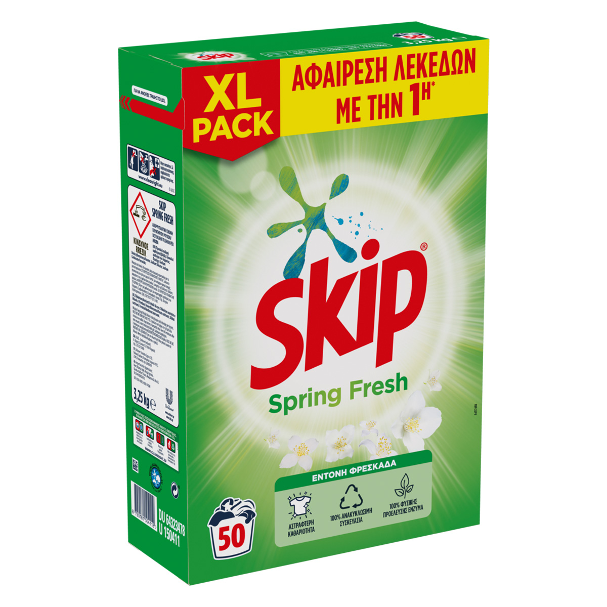 Το Skip Spring Fresh με 100% φυσικής προέλευσης ένζυμα χαρίζει εκπληκτικά αποτελέσματα με την πρώτη πλύση. Αφαιρεί δύσκολους λεκέδες χαρίζοντας στα ρούχα σας έντονη φρεσκάδα που διαρκεί. Η πρωτοπόρα σύνθεσή του το καθιστά αποτελεσματικό και στο σύντομο πρόγραμμα.