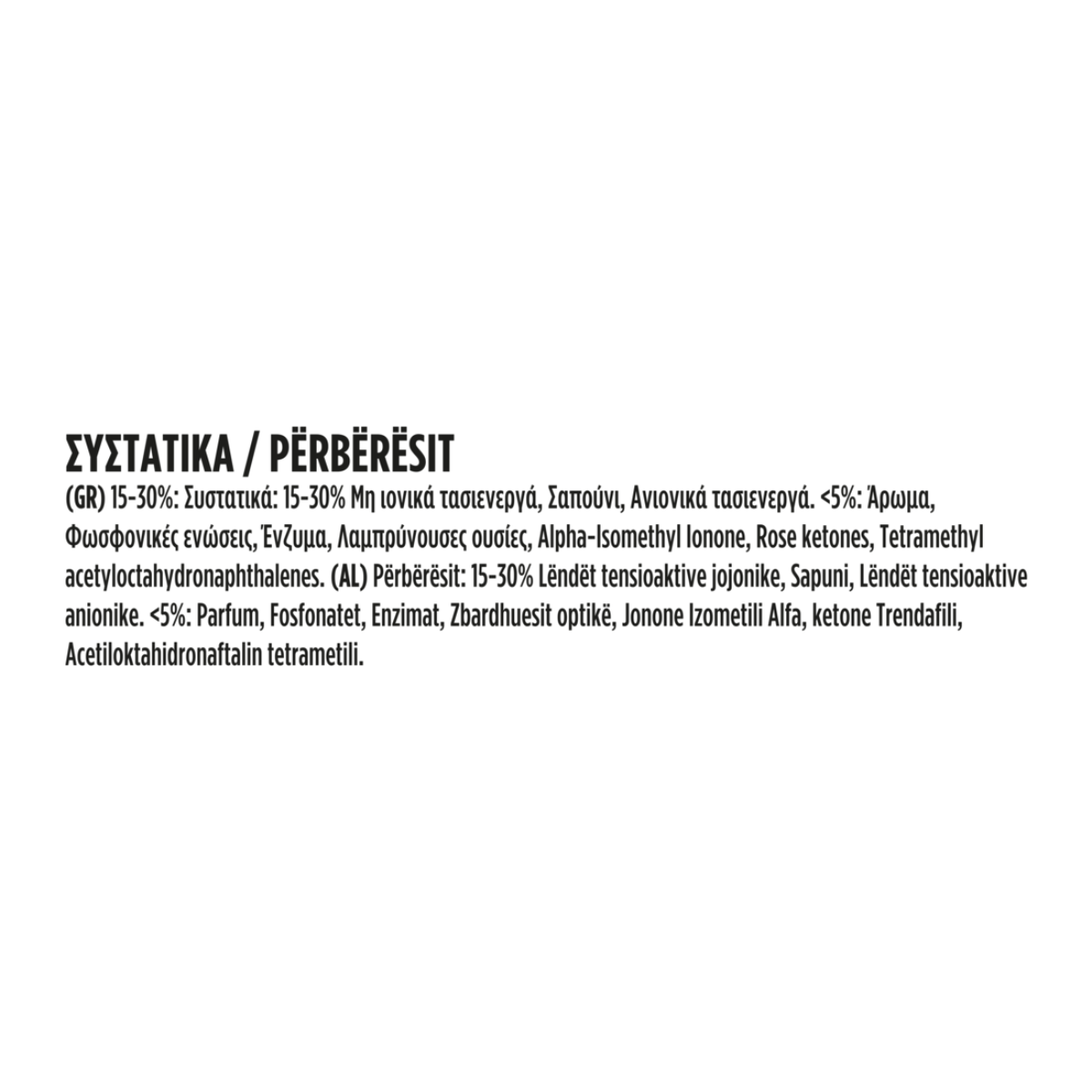 15-30%: Μη Ιονικά Τασιενεργά, Σαπούνι, Ανιονικά τασιενεργά. <5%: Άρωμα, Φωσφονικές ενώσεις, Ένζυμα, Λαμπρύνουσες ουσίες, Alpha-Isomethyl Ionone.