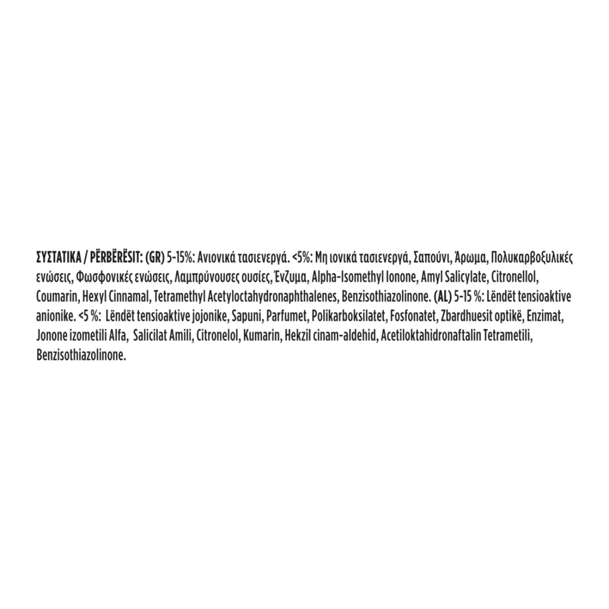 5-15 %: Ανιονικά τασιενεργά, <5 %: Μη ιονικά τασιενεργά, Σαπούνι, Άρωμα, Πολυκαρβοξυλικές ενώσεις, Φωσφονικές ενώσεις, Λαμπρύνουσες ουσίες, Ένζυμα, Alpha-Isomethyl Ionone, Citronellol, Coumarin, Hexyl Cinnamal, Methylisothiazolinone, Octylisothiazolinone.