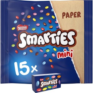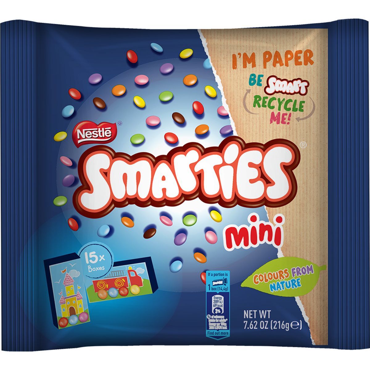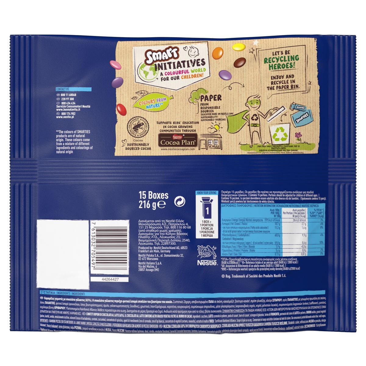 Κουφετάκια γεμιστά με σοκολάτα γάλακτος (65%). Η σοκολάτα γάλακτος περιέχει φυτικά λιπαρά επιπλέον του βουτύρου του κακάο. Τα αγαπημένα Smarties® καλούν μικρά και μεγάλα παιδιά να ξεκλειδώσουν τη φαντασία τους δημιουργώντας έναν πολύχρωμο κόσμο. Καθένα από τα 8 χρώματα των Smarties® προέρχονται από φυσικά εκχυλίσματα φρούτων και λαχανικών – χωρίς προσθήκη τεχνητών αρωματικών υλών ή συντηρητικών. Η λαχταριστή, απαλή σοκολάτα που βρίσκεται στην καρδιά των Smarties® προέρχεται από ποιοτικούς κόκκους κακάο που έχουν συλλεχθεί με βάση το Nestle Cocoa Plan και προέρχονται από πιστοποιημένες και 100% αειφόρες πηγές.