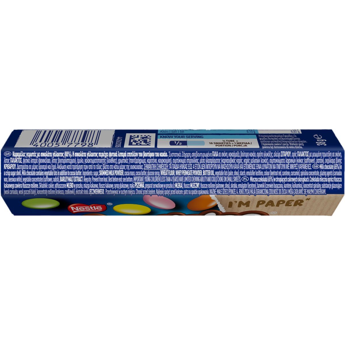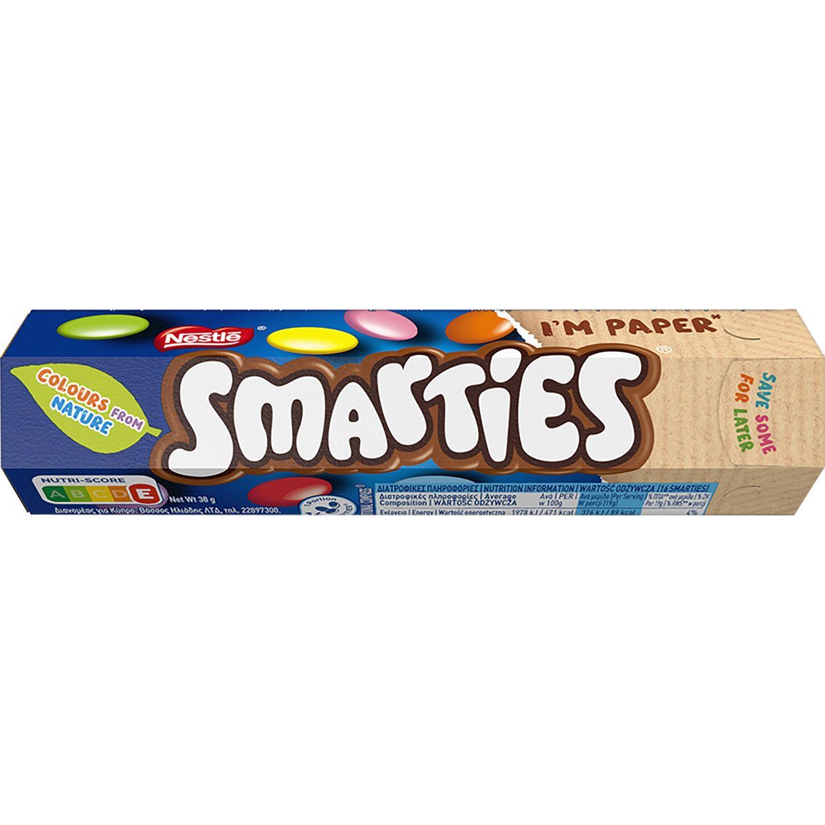 ΝESTLE SMARTIES® Κουφετάκια γεμιστά με σοκολάτα γάλακτος (65%). Η σοκολάτα γάλακτος περιέχει φυτικά λιπαρά επιπλέον του βουτύρου του κακάο. Τα αγαπημένα Smarties® καλούν μικρά και μεγάλα παιδιά να ξεκλειδώσουν τη φαντασία τους δημιουργώντας έναν πολύχρωμο κόσμο. Καθένα από τα 8 χρώματα των Smarties® προέρχονται από φυσικά εκχυλίσματα φρούτων και λαχανικών – χωρίς προσθήκη τεχνητών αρωματικών υλών ή συντηρητικών. Η λαχταριστή, απαλή σοκολάτα που βρίσκεται στην καρδιά των Smarties® προέρχεται από ποιοτικούς κόκκους κακάο που έχουν συλλεχθεί με βάση το Nestle Cocoa Plan και προέρχονται από πιστοποιημένες και 100% αειφόρες πηγές. Επιπλέον, η χάρτινη συσκευασία των Smarties® είναι πλήρως ανακυκλώσιμη και διαθέτει πληροφορίες για ορθή απόρριψη, προσκαλώντας μικρούς και μεγάλους να γίνουν οι σύγχρονοι “σούπερ-ήρωες” της ανακύκλωσης.