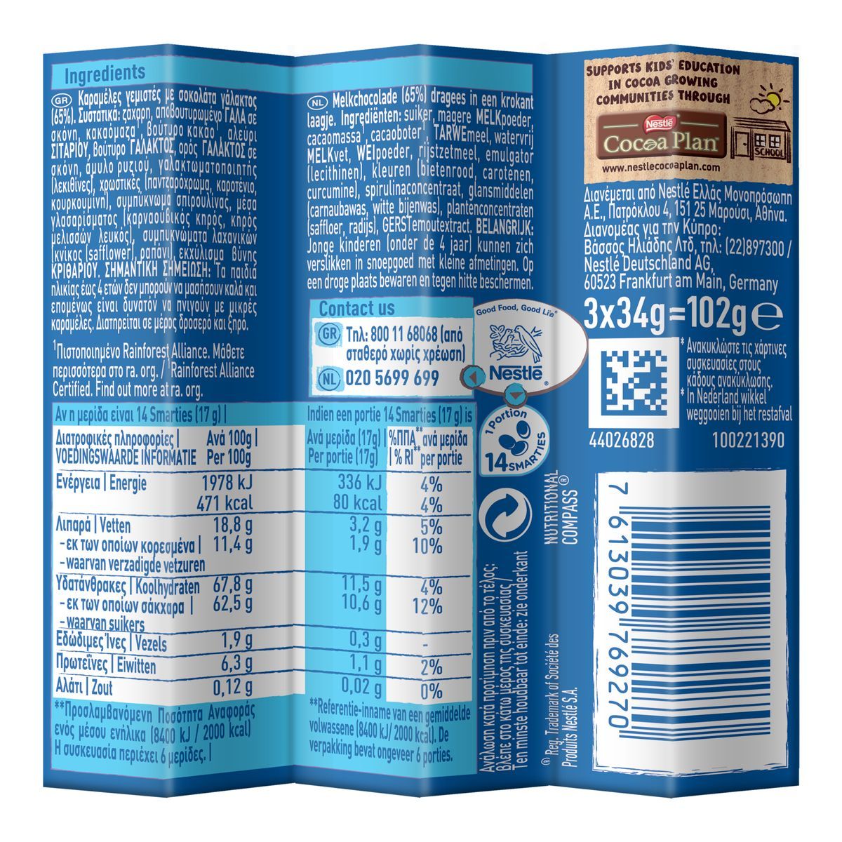 SMARTIES® 3x34g. Καραμέλες γεμιστές με σοκολάτα γάλακτος. Η σοκολάτα γάλακτος περιέχει φυτικά λιπαρά επιπλέον του βουτύρου του κακάο. Τα αγαπημένα Smarties® καλούν μικρά και μεγάλα παιδιά να ξεκλειδώσουν τη φαντασία τους δημιουργώντας έναν πολύχρωμο κόσμο. Καθένα από τα 8 χρώματα των Smarties® προέρχονται από φυσικά εκχυλίσματα φρούτων και λαχανικών – χωρίς προσθήκη τεχνητών αρωματικών υλών ή συντηρητικών. Η λαχταριστή, απαλή σοκολάτα που βρίσκεται στην καρδιά των Smarties® προέρχεται από ποιοτικούς κόκκους κακάο που έχουν συλλεχθεί με βάση το Nestle Cocoa Plan και προέρχονται από πιστοποιημένες και 100% αειφόρες πηγές.