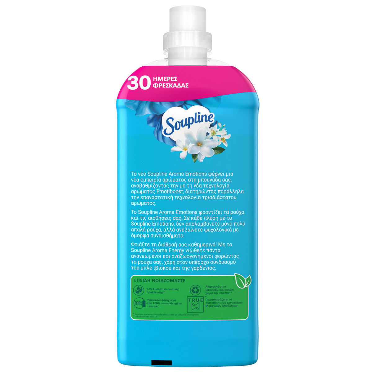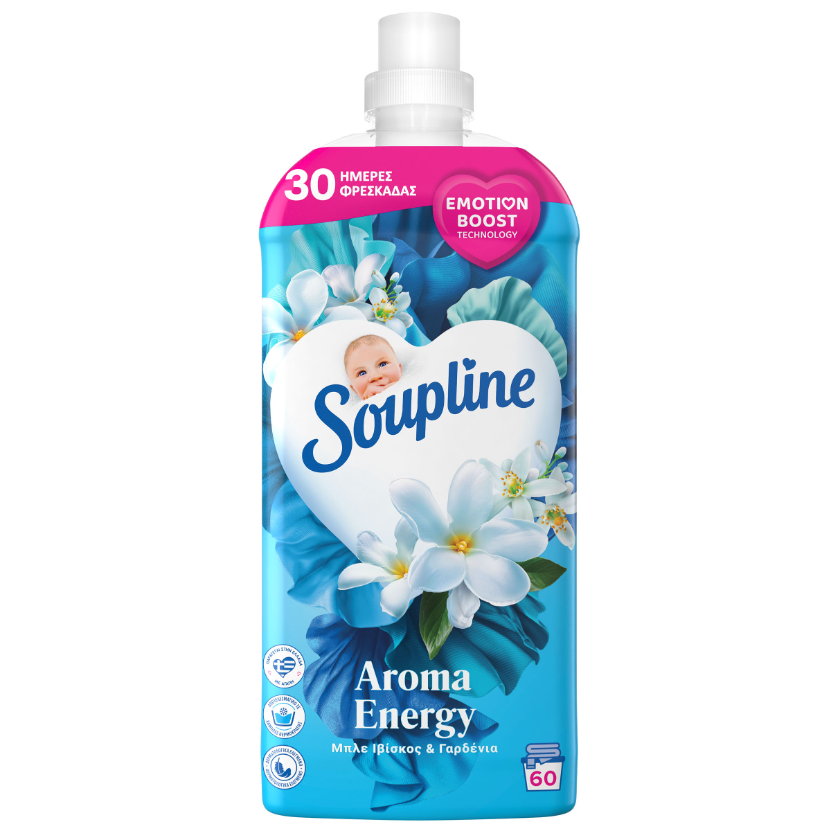 Το νέο Soupline Aroma Energy Μπλε Ιβίσκος & Γαρδένια φέρνει μια νέα εμπειρία αρώματος στη μπουγάδα σας,αναβαθμίζοντας την με την νεα τεχνολογία αρώματος Emotiboost,διατηρώντας παράλληλα την επανασταστική τεχνολογία τριασδιάστατου αρώματος. Με το Soupline Aroma Energy Μπλε Ιβίσκος & Γαρδένια νιώθετε πάντα ανανεωμένοι και αναζωογονημένοι φορώντας τα ρούχα σας, χάρη στον υπέροχο συνδυασμό του μπλε ιβίσκου και της γαρδένιας. Έχει 92% συστατικά φυσικής προέλευσης και ανακυκλώσιμο μπουκάλι κατασκευασμένο από 100% ανακυκλωμένο πλαστικό.