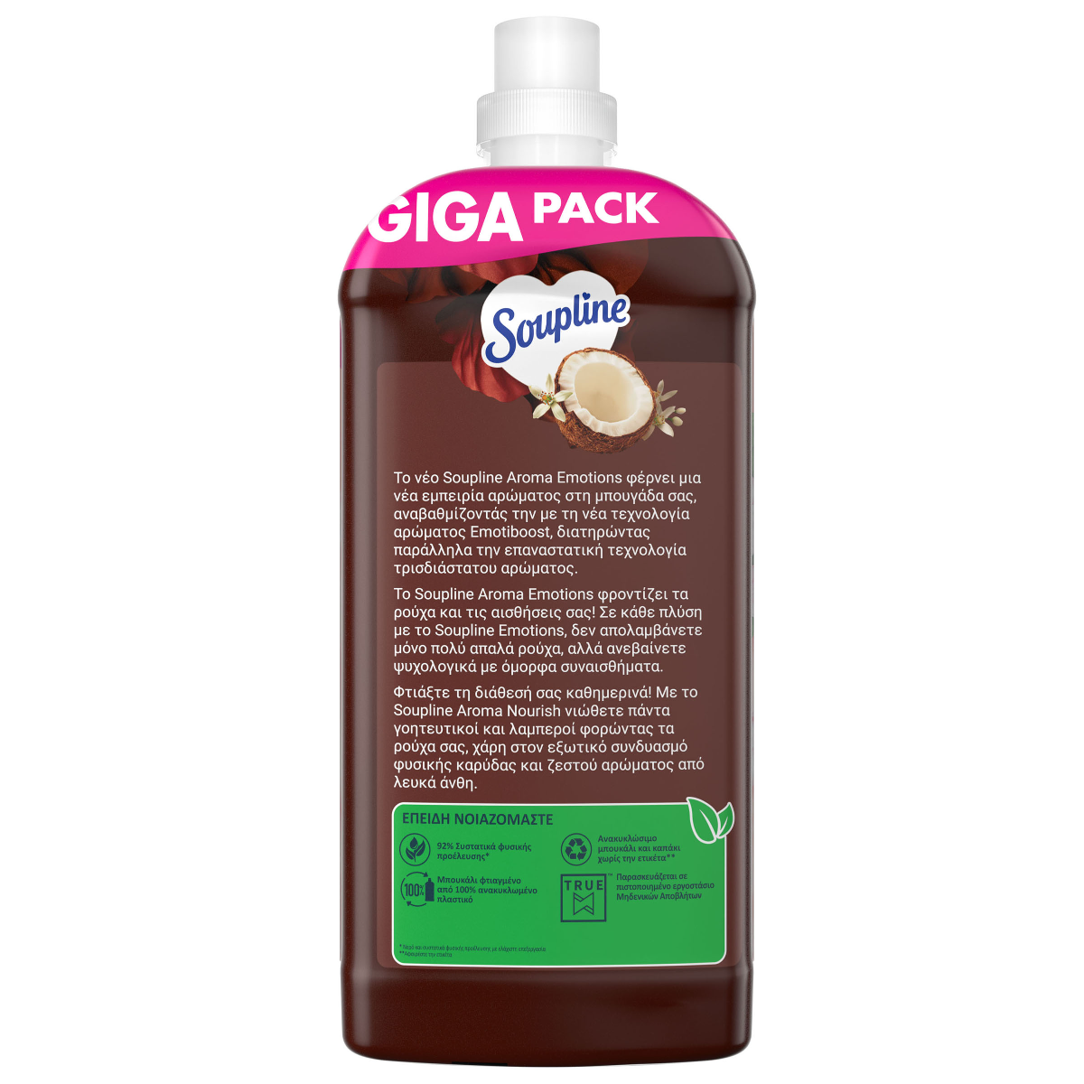 Το νέο Soupline Aroma Nourish Καρύδα & Λευκά Άνθη φέρνει μια νέα εμπειρία αρώματος στη μπουγάδα σας, αναβαθμίζοντας την με την νεα τεχνολογία αρώματος Emotiboost, διατηρώντας παράλληλα την επανασταστική τεχνολογία τριασδιάστατου αρώματος. Με το Soupline Aroma Nourish Καρύδα & Λευκά Άνθη νιώθετε πάντα γοητευτικοί και λαμπεροί φορώντας τα ρούχα σας, χάρη στον εξωτικό συνδυασμό καρύδας και ζεστού αρώματος απο λευκά άνθη. Έχει 92% συστατικά φυσικής προέλευσης και ανακυκλώσιμο μπουκάλι κατασκευασμένο από 100% ανακυκλωμένο πλαστικό.