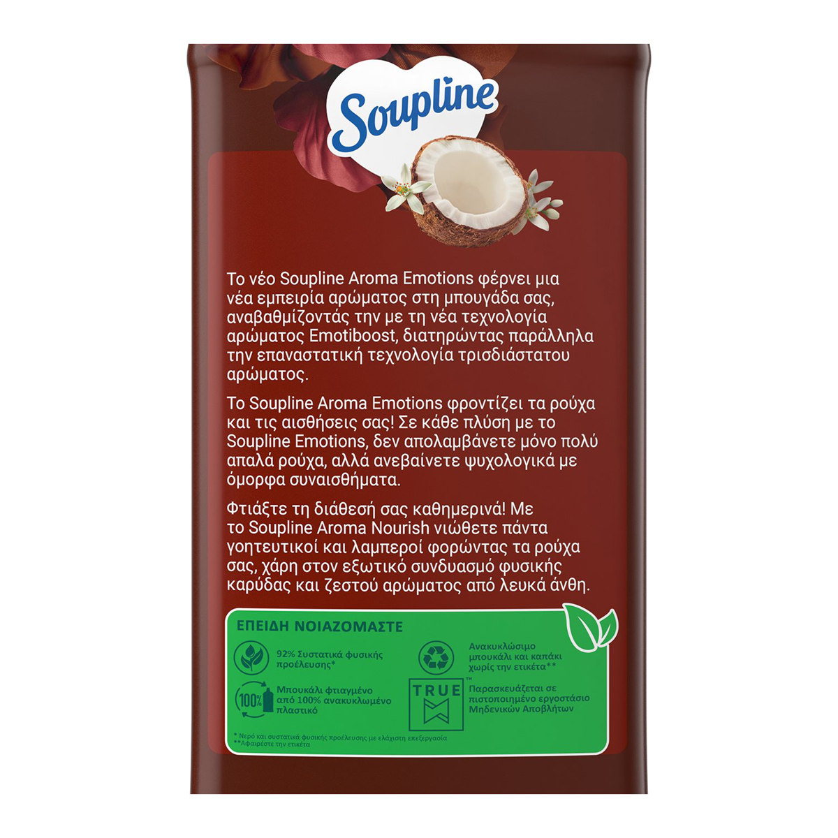 Το συμπυκνωμένο μαλακτικό Soupline Aroma Nourish Καρύδα & Λευκά Άνθη με αιθέρια έλαια επαναπροσδιορίζει το πλύσιμο των ρούχων με την επαναστατική 3D τεχνολογία αρώματος, έναν μοναδικό συνδυασμό 3 διαφορετικών τεχνολογιών, προσφέροντας μια εκπληκτική εμπειρία αισθήσεων καλύτερη από ποτέ.