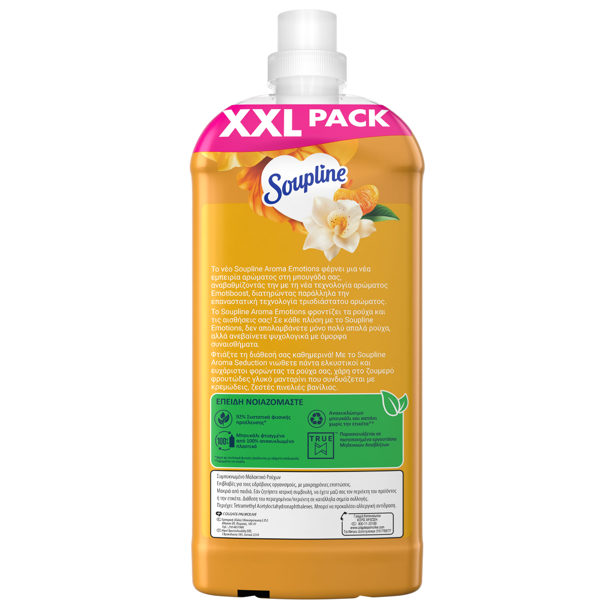 Το νέο Soupline Aroma Seduction Βανίλια & Μανταρίνι φέρνει μια νέα εμπειρία αρώματος στη μπουγάδα σας, αναβαθμίζοντας την με την νεα τεχνολογία αρώματος Emotiboost, διατηρώντας παράλληλα την επανασταστική τεχνολογία τριασδιάστατου αρώματος. Με το Soupline Aroma Seduction Βανίλια & Μανταρίνι νιώθετε πάντα ελκυστικοί και ευχάριστοι φορώντας τα ρούχα σας, χάρη στο ζουμερό φρουτώδες γλυκό μανταρίνι που συνδυάζεται με κρεμώδεις, ζεστές πινελιές βανίλιας.Έχει 92% συστατικά φυσικής προέλευσης και ανακυκλώσιμο μπουκάλι κατασκευασμένο από 100% ανακυκλωμένο πλαστικό.