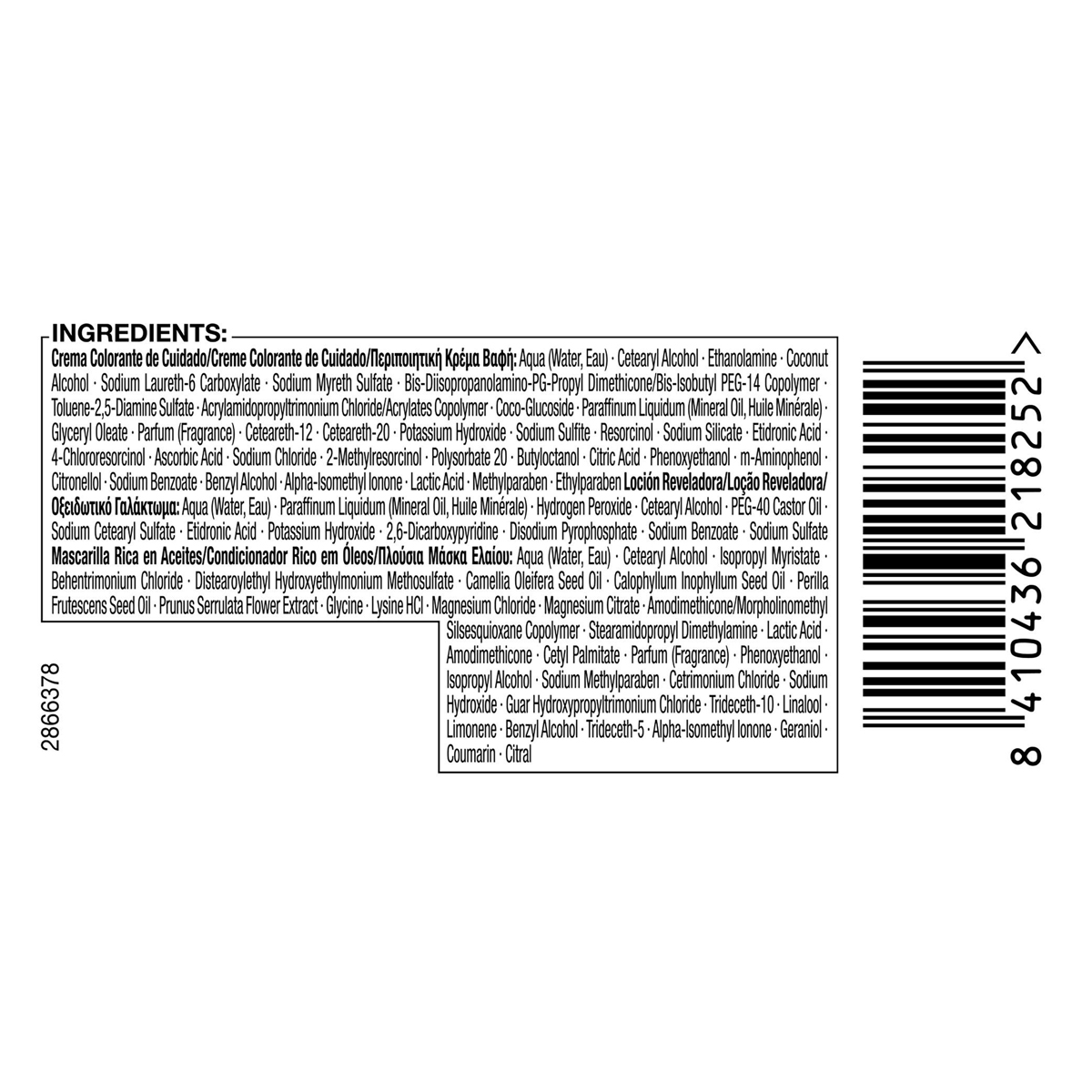 Hair Color, Toner, oxidative dyes:Aqua (Water, Eau), Cetearyl Alcohol, Ethanolamine, Coconut Alcohol, Sodium Laureth-6 Carboxylate, Sodium Myreth Sulfate, Glycine, Toluene-2,5-Diamine Sulfate, Bis-Diisopropanolamino-PG-Propyl Dimethicone, Bis-Isobutyl PEG-14 Copolymer, Acrylamidopropyltrimonium Chloride, Acrylates Copolymer, Coco-Glucoside, Paraffinum Liquidum (Mineral Oil, Huile Minerale), Glyceryl Oleate, Ceteareth-12, Ceteareth-20, Potassium Hydroxide, Parfum (Fragrance), Sodium Sulfite, Resorcinol, Sodium Silicate, Etidronic Acid, 4-Chlororesorcinol, Ascorbic Acid, Sodium Chloride, 2-Methylresorcinol, Butyloctanol, Citric Acid, Polysorbate 20, Phenoxyethanol, m-Aminophenol, Citronellol, Lactic Acid, Benzyl Alcohol, Alpha-Isomethyl Ionone, Sodium Benzoate, Methylparaben, Ethylparaben Developer:Aqua (Water, Eau), Paraffinum Liquidum (Mineral Oil, Huile Minerale), Hydrogen Peroxide, Cetearyl Alcohol, PEG-40 Castor Oil, Sodium Cetearyl Sulfate, Etidronic Acid, Potassium Hydr