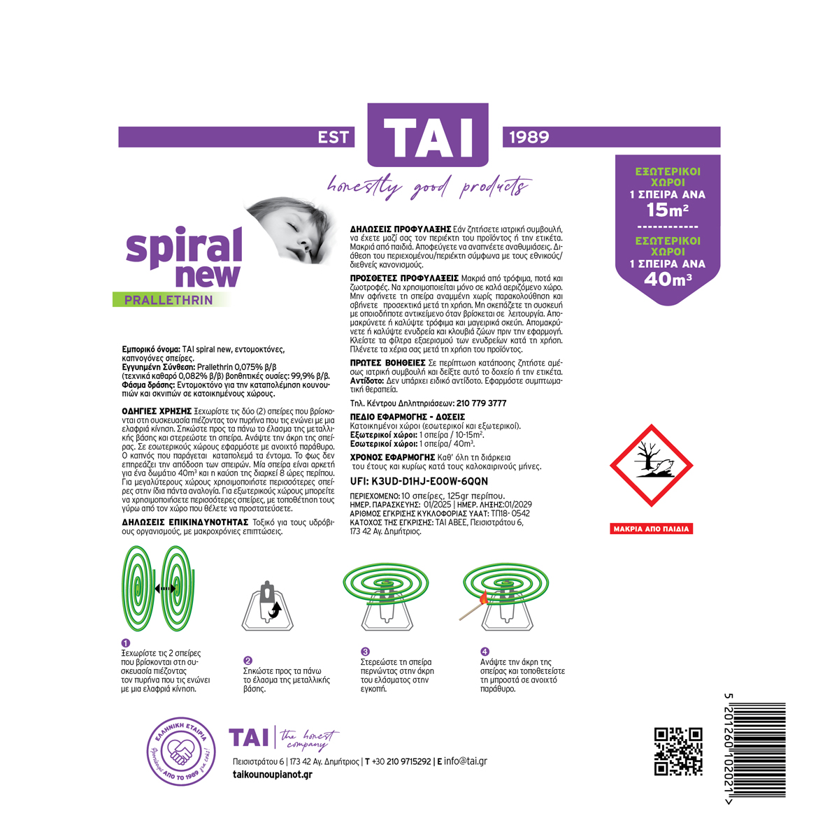 TAI New Spiral εντομοκτόνες σπείρες για προστασία ενάντια σε κουνούπια και σκνίπες . Περιέχει τη δραστική ύλη PRALLETHRIN που είναι μία σύγχρονη δραστική ουσία για την αποτελεσματική καταπολέμηση κουνουπιών & σκνιπών. Στην σύνθεσή τους δεν περιέχουν ΑΛΛΕΡΓΙΟΓΟΝΕΣ ουσίες (0%) (αριθμός έγκρισης κυκλοφορίας : ΥΠ.Α.Α.Τ ΤΠ18-0542).