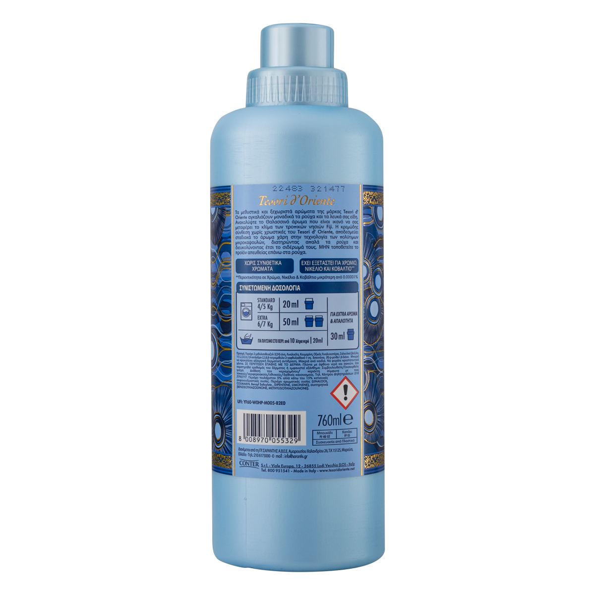 Τα μεθυστικά και ξεχωριστά αρώματα της μάρκας Tesori D'Oriente αγκαλιάζουν μοναδικά τα ρούχα και τα λευκά σας είδη. Ανακαλύψτε το Θαλασσινό άρωμα που ειναι ικανό να σας μεταφέρει το κλίμα των τροπικών νησιών Fiji. Η κρεμώδης σύνθεση χωρίς χρωστικές του Tesori D'Oriente, αποδεσμεύει σταδιακά το άρωμα χάρη στην τεχνολογία των πολύτιμων μικροκαψουλών, διατηρώντας απαλά τα ρούχα και διευκολύντας έτσι το σιδέρωμα τους.