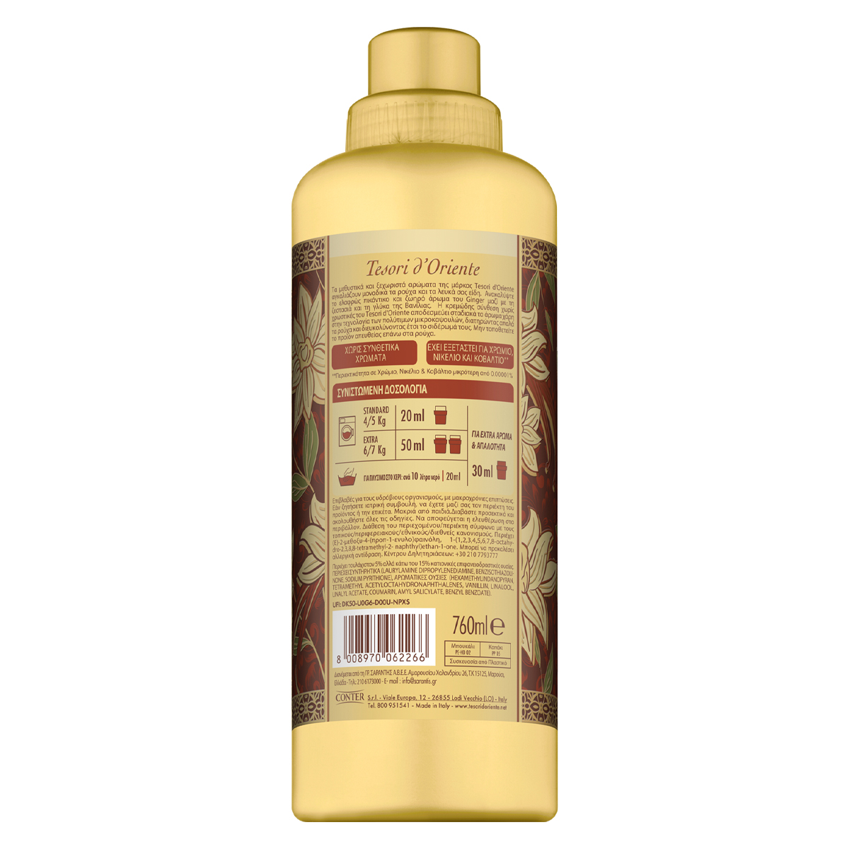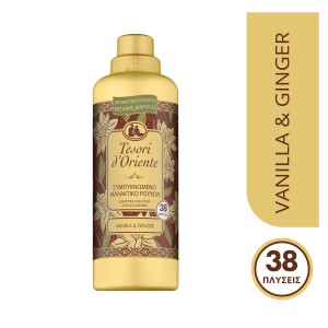 Τα μεθυστικά και ξεχωριστά αρώματα της μάρκας Tesori d'Oriente αγκαλιάζουν μοναδικά τα ρούχα και τα λευκά σας είδη. Ανακαλύψτε το ελαφρώς πικάντικο και ζωηρό άρωμα του Ginger μαζί με τη ζεστασιά και τη γλύκα της Βανίλιας. Η κρεμώδης σύνθεση χωρίς χρωστικές του Tesori d'Oriente, αποδεσμεύει σταδιακά το άρωμα χάρη στην τεχνολογία των πολύτιμων μικροκαψουλών, διατηρώντας απαλά τα ρούχα και διευκολύντας έτσι το σιδέρωμα τους.