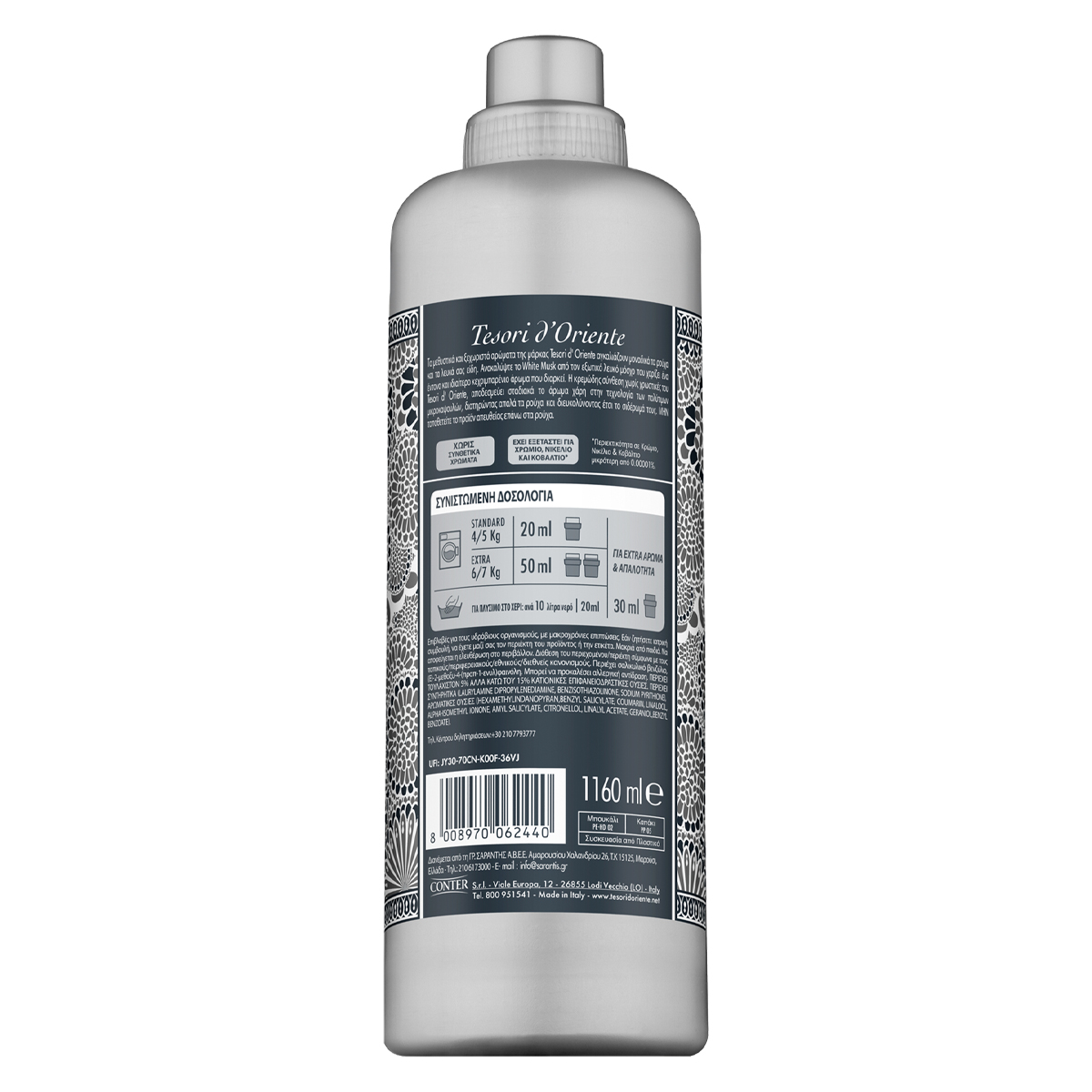 Τα μεθυστικά και ξεχωριστά αρώματα της μάρκας Tesori D'Oriente αγκαλιάζουν μοναδικά τα ρούχα και τα λευκά σας είδη. Ανακαλύψτε το White Musk από τον εξωτικό λευκό μόσχο που χαρίζει ένα έντονο και ιδιαίτερο κεχριμπαρένιο άρωμα που διαρκεί. Η κρεμώδης σύνθεση χωρίς χρωστικές του Tesori D'Oriente, αποδεσμεύει σταδιακά το άρωμα χάρη στην τεχνολογία των πολύτιμων μικροκαψουλών, διατηρώντας απαλά τα ρούχα και διευκολύντας έτσι το σιδέρωμα τους.